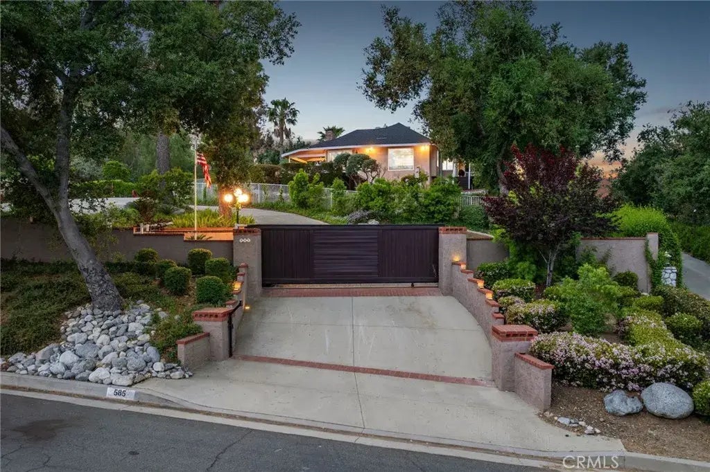 Discover your dream home in this private, gated estate, nestled on a lush 0.65-acre lot in the heart of San Dimas. A grand, sweeping concrete driveway with elegant brick ribbon accents guides you to an oversized three-car garage, with ample space on the property for additional vehicles. Manicured grounds and a charming brick walkway lead to a covered front porch, setting the tone for the luxury within. Main level renovated in 2015. Step through double iron-and-glass doors into a stunning great room, where diagonally laid hardwood floors flow seamlessly into the family room. Here, French doors open to a wraparound balcony with sweeping views, complemented by a large picture window, crown molding, and a striking brick fireplace with a full mantle. The remodeled kitchen features stainless steel appliances, a built-in refrigerator/freezer, a gas cooktop, dual islands (one with bar seating), a cozy breakfast nook with deck access, and a walk-in pantry. Adjacent, the formal dining room boasts plantation shutters and serene front yard views, while the formal living room dazzles with LED recessed lighting, a wall of shuttered windows, and a tiled fireplace with a mantle surround. The main level offers versatile living spaces, including a private office with an attached half bathroom, a bedroom with a full en-suite bathroom, and a spacious laundry room that doubles as a convenient mudroom. Upstairs, renovated in 2025, the luxurious primary suite awaits, featuring double entry doors, hardwood floors, a tranquil retreat area, and French doors to a private balcony. The fully remodeled