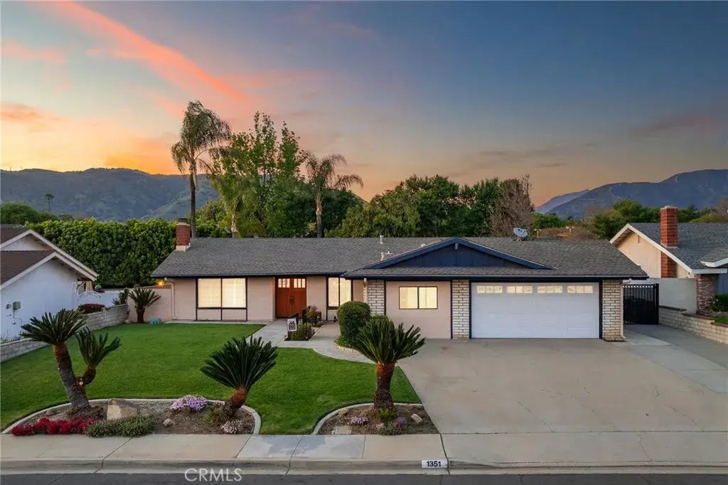 Discover a meticulously maintained single-story gem in the heart of a sought-after La Verne neighborhood. The inviting front yard boasts a green lawn, vibrant flower-filled concrete border planters, and striking Sago palms, guiding you along a concrete walkway to new double front doors. Step inside to a tiled entryway that opens to a stunning living room, featuring soaring vaulted ceilings, an exposed beam, a wrought-iron accent wall, and a custom marble fireplace flanked by symmetrical built-in bookcases. The seamless flow continues into the open-concept family room and elegantly crafted kitchen. The kitchen offers rich wood cabinetry, tiled countertops and backsplash, LED lighting, and a peninsula with casual countertop seating-perfect for morning coffee or lively gatherings. The family room, featuring hardwood floors, a custom built-in bookcase, and an Anderson sliding door, invites you to the serene backyard. The oversized primary suite is a tranquil retreat, offering carpeted floors, two walls of closet space, a bay window with plantation shutters overlooking the backyard, and en-suite bathroom with a custom-tiled shower and sliding glass enclosure. Two additional generously sized bedrooms and a well-appointed full hall bathroom provide ample space for family or guests. A versatile office/laundry room (previously a third car garage space), leads to the attached two-car garage including a unique pull-through feature to the backyard. The expansive backyard is an outdoor haven, featuring a sprawling grass area with brick-bordered planters, an in ground spa with a concrete