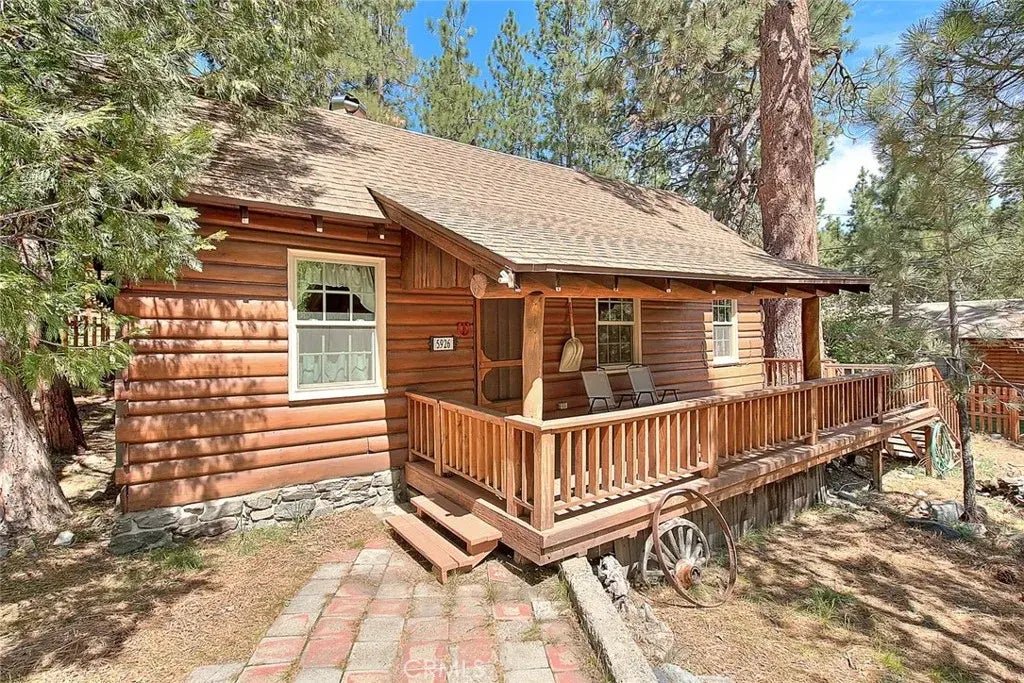 FURNISHED CHARMING CABIN 2 Bedroom Plus a Loft! Refinished 1/2 round Log Beams & Wrap Around Porch with an outside Deck. Great for BBQ and watching all the different Birds and Animals. Seasonal Stream in the Front yard with a Cute Rustic Bridge. Great year around property get away, rental or full time home, enjoy the 4 seasons and peaceful area! Fenced Large 10,000 square foot Corner Lot has many Pine Trees and an Apricot Tree, along with Seasonal Flowers to enjoy! This lot will hold up to 3 vehicles as it sits now but can be used for more vehicles or even an RV with some adjustments. As you walk into this Knotty Pine Historic Home you will feel the History and Charm! Wonderful Rock Fireplace with Large Wood Mantel. Hardwood Flooring in the living room along with a Newer Mini Split. Cute 2 Bedrooms with Newer Mini Splits for A/C and Heat. Each bedroom has dressers and one has a closet. Bathroom is located between both and has built in drawers. Stackable Washer & Dryer in hallway. Loft has 2 twin beds and storage for books or small items and looks out over the deck and yard. Kitchen is functional with a newer Retro Refrigerator and Antique Stove stays "as is". Has small eating area with vinyl flooring and Wainscoting and Stain Glass window in the door that leads to the outside Deck area. Larger Outside Shed stays. Improvements made over the last couple of years! *Newer Dual Pane Windows* Electrical Wiring and Outlets Updated*Newer Septic*Newer Posts added to Fencing*some Newer Lighting added* Great location close to downtown and public park, restaurants, library and Mountain