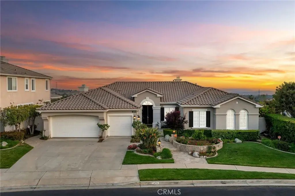 Stunning Single-Story Home with Panoramic Views in the Marshall Canyon Estates. Discover this coveted single-story gem, perfectly positioned on a prime view lot in the prestigious Marshall Canyon Estates. Enjoy breathtaking panoramic views and a seamless blend of indoor-outdoor living in this beautifully designed residence. The front yard welcomes you with flagstone finishes, lush landscaping, and a charming covered porch, creating exceptional curb appeal. Step through elegant double front doors into a spacious, tiled entryway that opens to a bright formal living room and adjacent dining room. A wall of glass windows showcase stunning backyard and beyond views, complemented by a fireplace, a tray ceiling with crown molding, and a sliding glass door to the expansive outdoor space. The heart of the home is a spacious great room, featuring a modern kitchen with sleek white cabinetry, granite countertops, a stylish backsplash, a walk-in pantry, and a large island with seating- perfect for entertaining. The open family room offers built-in cabinetry, a second fireplace with a mantle, and windows with plantation shutters framing the backyard. Work from home in the versatile office, which overlooks the beautifully landscaped front yard and could serve as a fourth bedroom. A convenient half-bath for guests and a full indoor laundry room with a sink and ample storage add practicality to the layout. Retreat to the luxurious primary suite, featuring LVP flooring, crown molding, and expansive windows showcasing backyard views. The spa-like en suite bathroom boasts double sinks with a v