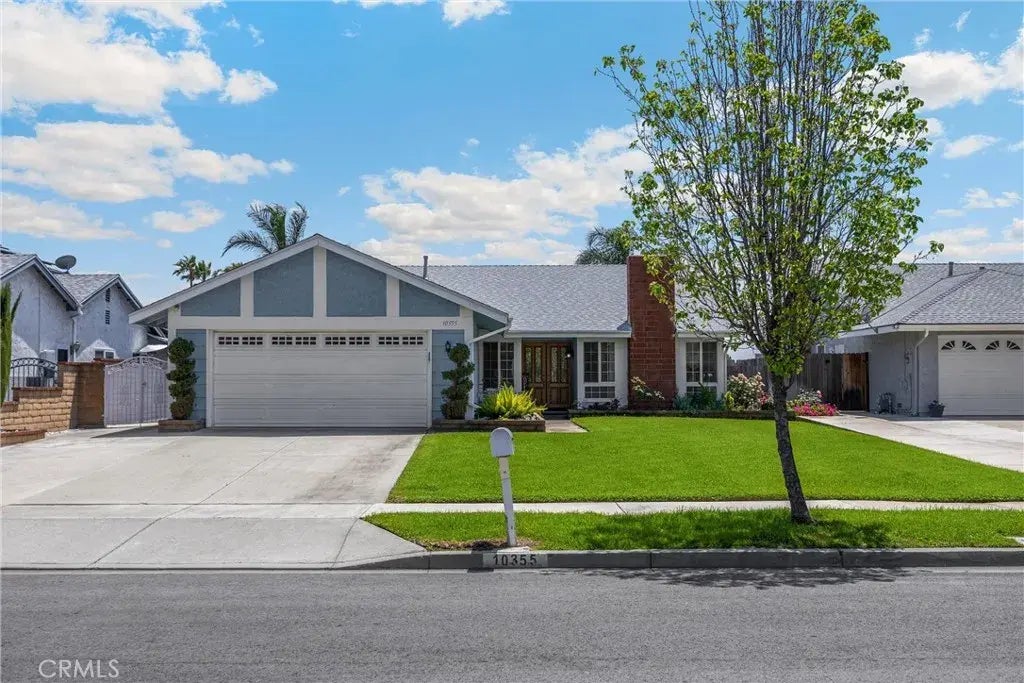 Welcome to 10355 Bristol! A spacious 3 bedroom, 2 bathroom home with the option for a 4th bedroomcurrently used as a cozy sitting room, easily convertible to fit your needs. Enjoy stunning curb appeal with a landscaped front yard and freshly painted exterior. Step through elegant double doors with glass inserts into a bright and inviting interior featuring marble tile flooring and brand-new carpet throughout. The kitchen boasts granite countertops, crisp white cabinetry, a brand-new stove/oven, and is bathed in natural sunlight. It opens seamlessly to the dining and family rooms, accentuated by soaring 12-foot ceilings and a sliding glass door leading to the backyard. (There is an option of a 4th bedroom; seller took down walls and made a den area.) The master suite offers a peaceful retreat with an oversized mirrored closet, private sliding door to the backyard, and an en-suite bath complete with double sinks and a walk-in shower. Additional highlights include a two-car garage with built-in cabinets, RV parking, and a roof that was redone at the beginning of the year. The landscaped backyard is a serene oasis that has a covered patio with ceiling fans, mature cypress trees and a variety of fruit trees including lemon, lime, grapefruit, and orange. Conveniently located near shopping centers, schools, parks, and easy freeway access.