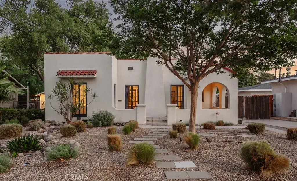 Welcome to this tastefully remodeled Spanish-style gem that perfectly blends classic charm with modern upgradesincluding fully paid-off solar panels for energy efficiency and low utility bills. This 2-bedroom, 2-bathroom home (plus detached office) features dark bamboo wood flooring and endless upgrades throughout the entire home while still retaining its original character. The open living room features a stone fireplace and large windows that allow natural light to flood the whole area. The dining room has original built-ins and windowed doors to the backyard. The bright and inviting kitchen is the heart of the home with herringbone tiled floors, quartz countertops, open shelving, newer appliances, and cozy eat-in bar area. The spacious primary bedroom opens directly to the inviting front porch. Both bedrooms have walk-in closets with built-in storage. The hallway bathroom was updated to match the style of the home with Spanish tile flooring and dark wood shelving. The original clawfoot tub was beautifully restored and is the perfect place to relax at the end of the day. The second bathroom includes a stylish tiled shower and a stackable washer and dryer conveniently located off the living room. Step outside to an expansive backyard oasis complete with a covered wooden deck, greenbelt, and a stone pathway leading to a detached officeideal for remote work or creative projects. The yard is perfectly set up for hosting with a rock area for a fire pit, beautiful trees providing lots of shade, fenced in garden areas, and fruit trees. A one-car garage, RV parking space, and dro