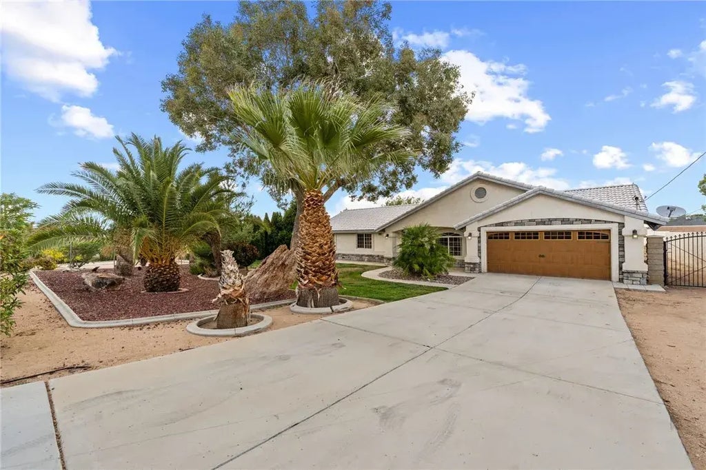 Welcome to your perfect One HOME in the city of Hesperia with an amazing floor plan and upgrades! Perfect blending of style and comfort, this home is ready to create lasting memories. Three spacious bedrooms and two beautiful bathrooms, all situated on a generous 19,000 sq. ft. lot. The family room has a cozy fireplace with nice tile and ample natural lighting creating a warm and inviting atmosphere. Home features ceiling fans, and Carpet in the bedrooms and family room. Kitchen has white cabinets, with Granite countertops, and all- stainless steel appliances, sink , and fixtures. Beautiful landscaping front and back. And the front electric gate.. Freshly painted interior . That's not all, this home has a nice backyard with patio and fire pit to relax, entertain guests, and host family barbecues; tool shed in the back for storage. Attached 2 car garage . this home will not last..