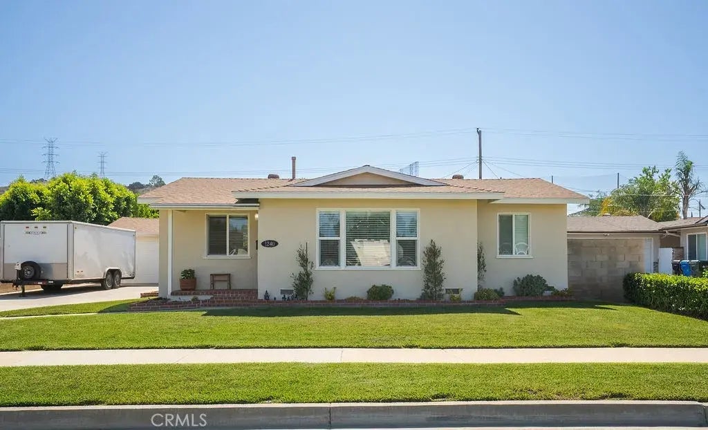 Welcome to this beautifully upgraded 3 bedroom 1.5 bathroom single-story home located on a cul-de-sac. As you enter, you will find newly refinished hardwood floors that flow throughout the home, complemented by elegant crown molding, recessed lighting, and ceiling fans that enhance the inviting ambiance. The residence features all newer dual-paned windows and window blinds, along with recently remodeled bathrooms showcasing updated tile and fixtures. With copper plumbing, a newer 200 amp electrical panel, central air and heat, this home is designed for modern living. The kitchen includes essential appliances like a stove and refrigerator, and for added peace of mind, a camera and security system are installed (note that a monitor is not provided). The exterior is equally impressive, with beautifully landscaped front and back yards featuring a sprinkler system, block walls, and a variety of mature fruit trees, including orange, lemon, and lime. A covered patio provides the perfect spot for barbecues, while the extra-wide cement driveway offers ample RV parking with electrical and sewer hook-ups. The detached garage is a versatile space, complete with interior drywall, insulation, a phone line, desk, and ample storage cupboards, along with a subpanel. The home also boasts a 30-year roof installed in 2018, and attic insulation updated in 2023. This property is a rare find, offering a lifestyle of comfort and convenience in a highly desirable location. Dont miss your opportunity to make this exceptional home your own! This exceptional property offers an unbeatable combination o