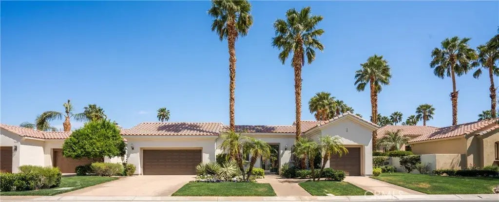 Welcome to the iconic private golf community of PGA West. Set on the 16th green of the Jack Nicklaus Tournament Course, this estate embodies the very essence of the Palm Desert lifestyle. Upon arriving, step through the gated entrance in to the private front courtyard. Like an oasis in the desert, with beautifully manicured landscaping, this space offers separation and privacy between the main home and the detached guest house. Stepping through the double glass front doors, you're immediately struck by the impressive 12 ft ceilings, and greeted by a vast wall of windows, providing abundant natural light. The generously sized family room allows you to host large gatherings, and easily mix the perfect cocktail for your guests at the nicely equipped wet bar, complete with built-in wine fridge. The dining table for 8 is supplemented by barstool seating for 5 more at the enormous kitchen island. The kitchen is perfect when cooking for a crowd, with a walk-in pantry, built-in fridge, plentiful quartz counters, and a 6 burner stove. Beyond the kitchen is the cozier family room with fireplace, built in desk space, and glass door leading to incredible outdoor California room. Enclosed on three sides to provide vital shade during the hot summer months, the large California room has ceiling fans, built in speakers, and recessed lighting. It's the perfect place to enjoy dinner al fresco, while soaking in the views of your sparkling pool and the golf course beyond. The salt water pool is perfectly sized, and the hot tub means you can enjoy your backyard views year-round. Back inside, th