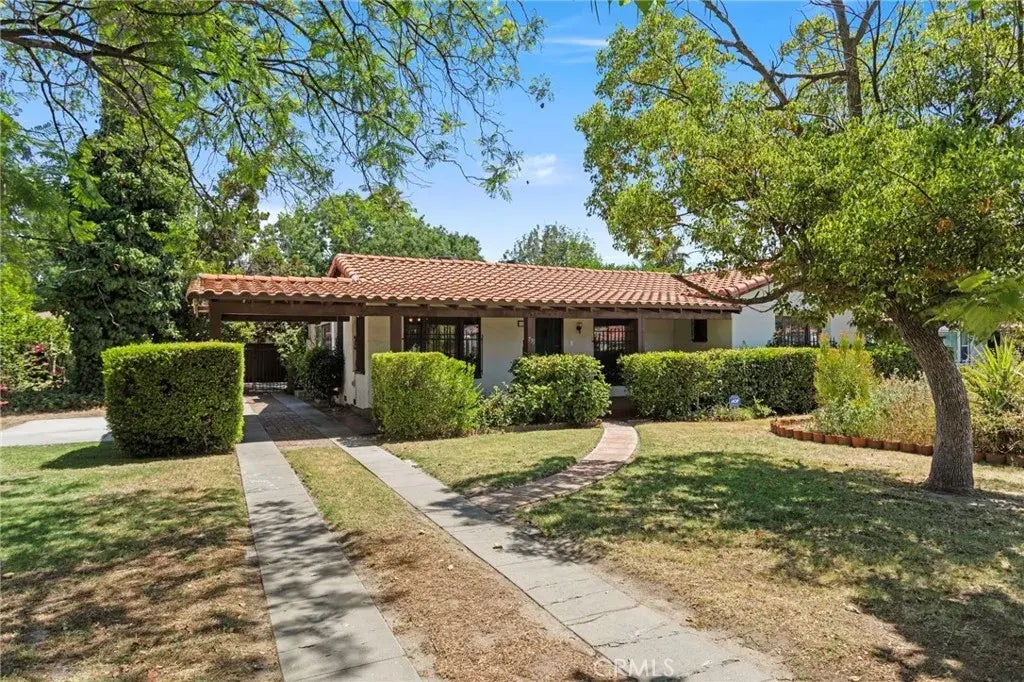 Welcome to this charming Spanish-style home full of character and potential, tucked away on a well-kept street in the heart of San Bernardino. As you pull up, youll notice the beautiful mature trees and a wide, green lawn that give this home great curb appeal. Step inside and youre greeted by a spacious living room with high wood-beamed ceilings, original hardwood floors, a cozy fireplace, and vintage wall sconces that add tons of charm. To one side of the house, theres a formal dining room perfect for hosting dinner with family and friends, a quaint kitchen with an adjacent breakfast nook featuring built-insgreat for your morning coffeeand a separate laundry room with plenty of storage. On the opposite side, youll find three generously sized bedrooms and two bathrooms, including one thats been nicely updated with new vinyl flooring, a modern vanity, and a refreshed shower. At the heart of the home, overlooking the peaceful backyard, is a cozy family room with a wood-burning stove and Spanish tile flooringsuch a warm and inviting space to relax. Natural light pours in through large windows throughout the home, and the private, shaded backyard is ideal for unwinding or entertaining guests. Theres also a detached 2-car garage that was previously used as a workshop, giving you extra space for hobbies, projects, or storage. The tile roof was replaced in 2016 and new HVAC units were installed in 2022! This homes timeless design, spacious layout, and unique details make it a rare opportunity to bring your vision to life. Dont miss it!