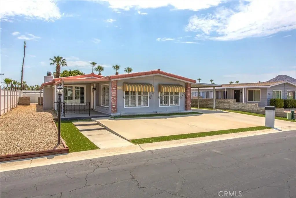 Welcome to this beautifully updated 2-bedroom, 2-bathroom home with a spacious den or office, located in the highly desirable 55+ community of Portola Country Club. This move-in-ready residence features new luxury laminate flooring, brand new carpet in both bedrooms, fresh interior paint, and updated light fixtures throughout. The kitchen is equipped with a new stovetop and dishwasher, and the home also includes a brand new central HVAC system for year-round comfort. Both the primary and hall bathrooms have been thoughtfully remodeled with modern finishes, and plantation shutters add a stylish touch to every room. Additional upgrades include new interior doors and hardware, an extra-long driveway that provides ample parking, and a low-maintenance backyard with artificial turfperfect for relaxing or entertaining. From the private patio, enjoy breathtaking panoramic mountain views. The home sits on fee land and includes a recorded 433A, making it eligible for traditional financing options. Living at Portola Country Club means enjoying a vibrant, well-maintained community with exceptional amenities. Residents have access to a secure gated entrance, on-site management, free 18-hole golf, cable TV and high-speed Wi-Fi, three community pools and spas, tennis and pickleball courts, a fitness center, and a dog park. This friendly community is conveniently located close to shopping, dining, and all that the desert lifestyle has to offer.