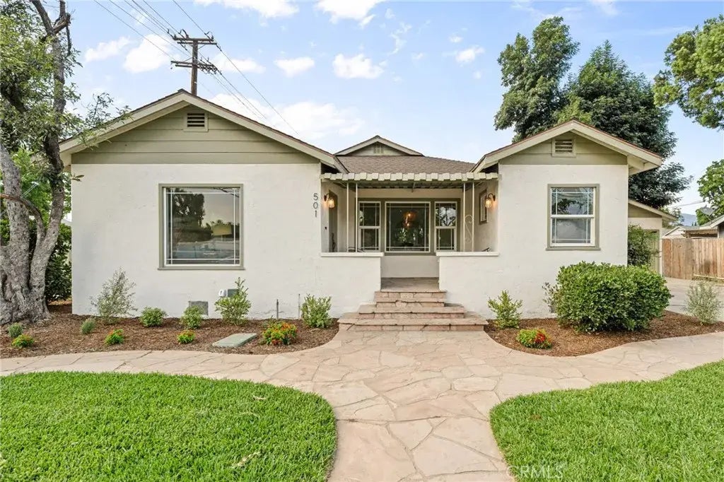Welcome to 501 E 5th Street, a beautifully updated single-story home situated on a spacious corner lot in highly sought after North Ontario. This 3 bedroom, 2 bathroom residence blends timeless charm with tasteful modern upgrades, offering a truly move-in ready experience. From the moment you arrive, you'll be drawn in by the manicured landscaping, inviting stone walkway, custom wood fence, quaint front porch and freshly painted exterior that enhance its curb appeal. Step inside to a bright and airy living room featuring original refinished hardwood floors, recessed lighting, and large dual-pane windows that fill the home with natural light. A classic fireplace serves as the focal point of the space, adding warmth and character. The open layout flows into the dining area and a fully remodeled kitchen equipped with custom wood soft close cabinets, quartz countertops, high end stainless steel appliances, a large center island, and stylish brass hardware. Just off the kitchen is a cozy breakfast nook with surrounding windows that overlook the front yard, creating the perfect setting for morning coffee or casual meals. The primary suite is spacious and serene, offering a walk-in closet and a beautifully remodeled en-suite bathroom with dual sinks, quartz counters, a walk in shower and a deep soaking tub wrapped in designer tile. The two additional bedrooms are generously sized with ample closet space and ceiling fans and share a tastefully renovated full bathroom featuring updated tile, elegant finishes, and modern lighting. Additional features include fresh interior and exteri