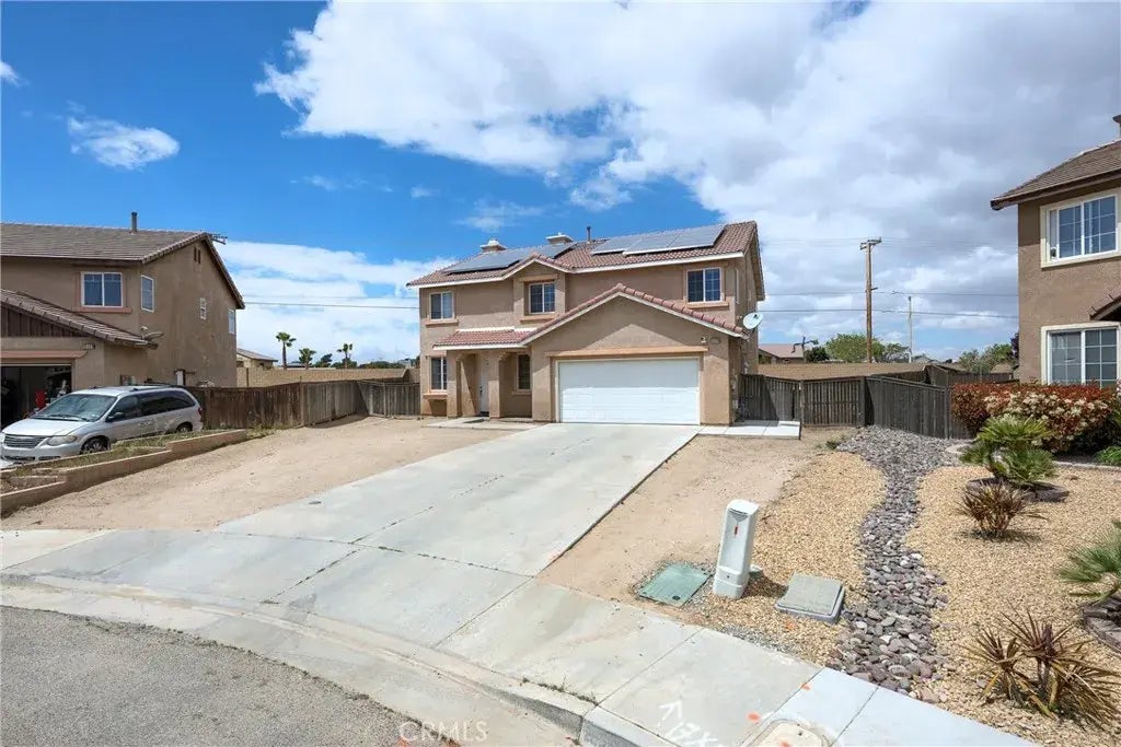 Welcome to this spacious two-story home nestled in the heart of Hesperia. Featuring 4 bedrooms and 2.5 bathrooms, this 2432 sq ft residence offers the perfect blend of comfort and functionality. Situated on a generous 9583 sq ft lot, there's plenty of room to entertain, garden, or even add a pool. This home features leased solar panels, enhancing energy efficiency and helping reduce monthly utility costs. In the backyard, enjoy a comfortable shaded area under the awning, perfect for outdoor gatherings. The space also includes a built-in grill and a mini fridge, both of which will convey with the sale, making it ideal for entertaining. Step inside to find an open floor plan with abundant natural light, a gorgeous living area, and a well-appointed kitchen - ideal for both everyday living and hosting guests.