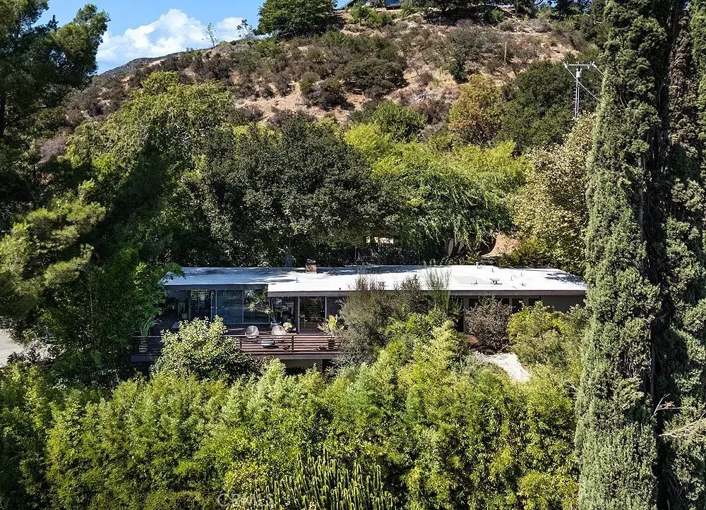 A true mid-century gem with a separate studio, this home is a rare blend of timeless design, privacy, and a lifestyle connected to nature. Offering dramatic architecture, beautiful views, and harmony with its surroundings, it is a work of art. Designed in 1960 by architect Jack Simison, AIA, this post-and-beam residence is located in Altadenas coveted Meadows neighborhood, a rare enclave of approximately 250 homes situated between El Prieto and Millard Canyons. Celebrated for its serenity and access to nature, The Meadows offers hiking trails throughout, while remaining just minutes from Pasadena shops, dining, Caltech, JPL, and Old Town. Tucked at the end of a quiet cul-de-sac, the home rests on an expansive lot with meandering stone paths and a botanical garden-like setting filled with native and drought tolerant plantings, and mature fruit trees, including citrus and persimmon. The tiered, multilevel gardens are seasonally enlivened with colorful blooms and fragrant flowers in spring through mid-summer. Expansive walls of glass bring the outdoors in, flooding the interiors with natural light and framing lush greenery and valley views. The 1,585 square foot main level features 2 bedrooms, 2 bathrooms, plus a library that could serve as a 3rd bedroom. Beneath the main level, the property also features a versatile 370 square foot permitted studio with 3/4 bath and a separate entrance, which offers endless flexibility as a home office, art studio, workshop, or guest suite. Additional highlights include cork floors in the living room, built-in cabinetry, louvered windows, and