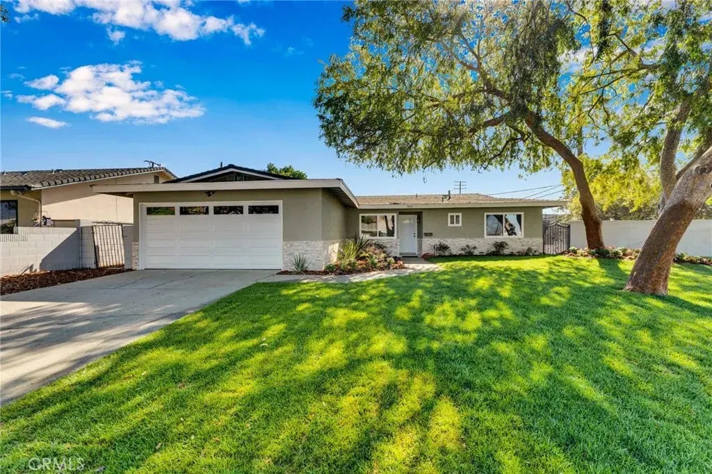 Welcome to this beautifully renovated single-story ranch-style home that combines modern updates with timeless charm. Step inside to find new windows, stylish light fixtures, and fresh finishes throughout. The heart of the home features a fully updated kitchen with stainless steel appliances and a cozy breakfast nook, while the dining area flows smoothly into the living room, complete with a tiled accent wall and fireplace. Both bathrooms have been thoughtfully remodeled, and one of the bedrooms is perfectly situated at the front of the house for privacy or a home office. Outside, enjoy the freshly landscaped front yard with new sod and vibrant flowers, plus a new concrete driveway leading to the attached 2-car garage. The expansive backyard is a blank canvas ideal for a future pool, garden, or outdoor entertaining space. A mature grapefruit tree, block wall fencing, and a covered patio spanning the back of the home provide shade, privacy, and plenty of potential. This move-in ready home truly has it all: modern upgrades, functional layout, and a yard that invites your imagination. ***Added Bonus*** New roof will be installed before the close of escrow!! <