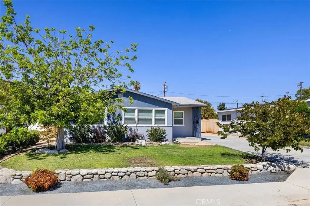 Single-story home set on a spacious lot with endless potential. The front yard features manicured landscaping with a river rock wall, planters, and mature trees. A covered front porch welcomes you into a bright entryway and family room with a large picture window overlooking the yard. Rich laminate wood flooring extends through the main living areas. The living room includes a built-in niche and sliding glass door to the back patio, while the updated kitchen offers granite countertops, tiled backsplash, refinished cabinetry, and a breakfast nook with front yard views. A convenient laundry closet and half bath are located just off the kitchen, with direct access to the driveway and garage. The home includes three bedrooms and a full hall bathroom featuring tiled counters, a walk-in shower with glass enclosure, and a separate tub. The enclosed covered patio provides additional living space and could easily be reopened as a traditional patio. The expansive backyard offers a large grass area, room for gardens, and space to add a pool or even an ADU. The home does offer a newer HVAC system.