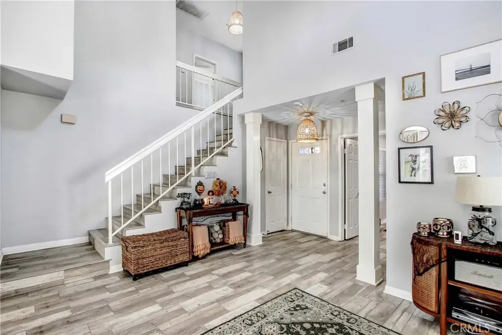 Available now! Unique opportunity to rent in the Master Planned East Highland Ranch, Enclave Community! This property boasts 3 bedrooms; two and a half bathrooms attached two car garage. Upon entering you are wowed away with the dramatic cathedral ceilings that open up to the formal dining and living room. There is a cozy built in bench in the family room to enjoy your morning coffee! The formal dining has French doors that open to a low Maintenace enclosed backyard. This property also offers a bedroom downstairs with a guest 1/2 bathroom. The kitchen is equipped with a gas stove, dishwasher and built in microwave. Dishwasher and built in microwave not warranted, maintained nor replaced during tenancy. Modern white kitchen cabinets, built in dish curio and custom pantry drawers. Breakfast counter wraps the kitchen Counter. The family room completes the 1st floor with a gas fireplace and stone fireplace surround. Additional French doors lead to the backyard. The stairs lead to the second level of the condo where you find the primary bedroom, walk in closet with ensuite bathroom. The primary host a balcony for fresh air and additional outdoor space. The 3rd bedroom is in the hallway and shared by the full-size hall bath. Laundry room located on 2nd floor with washer and dryer hookups. Updated laminate wood flooring and porcelain tile thought-out. Central Air and Heat. Ceiling fans in each of the bedrooms for extra cooling. One shared wall with your neighbor!