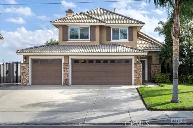 Welcome to this gorgeous house in the sought-after city of Ontario Ranch. This beautiful home greets you with a stunning curb appeal; perfectly landscaped with RV access and an iron wood gate. As you walk in, the living room welcomes you with high ceilings, a plethora of windows providing so much natural light and beautiful custom stone flooring. There are window shutters throughout the home, giving it that extra touch of elegance. The lower floor of the home features the living room, a beautiful kitchen that opens to the dining room that opens to the family room which has a nice chimney. There is a half bathroom downstairs along with a laundry room. As you go upstairs the view of the stairs and the balcony from the primary bedroom is excellent. This primary bedroom features a large walk-in closet, double sink bathroom, bathtub, shower and a beautiful view of the city. Its so spacious. There is a full bathroom upstairs along with two bedrooms. Both bedrooms are large, have ceiling fans, large closets, and beautiful views. The three-car garage is fully functional. One of the spaces is currently used as a game room/storage space. This home has leased solar panels, a brand new AC unit and the most gorgeous backyard featuring a large pool, with a brand new covered patio with lights, and vinyl fencing which was just installed. The possibilities here are endless, come make it yours before someone else does.