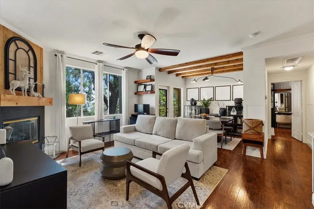 Welcome to this beautifully upgraded one-bedroom, one-bathroom condo in the highly sought-after Canyon Point community of Aliso Viejo. Designed with modern elegance, this home showcases laminate wood flooring, a sleek double vanity sink with side storage cabinets in the bathroom, custom accent wall moldings in the living area, hallway, bathroom, and charming wood ceiling beams in the dining area and bedroom. Additional built-in storage in the bedroom enhances functionality, while the freshly repainted interior and a new water heater ensure move-in-ready convenience. The kitchen and bathroom cabinets have also been refreshed for a contemporary, polished look. Enjoy resort-style amenities, including a pool, spa, fitness center, clubhouse, and night patrol security. This condo includes one assigned parking space with ample guest parking in a pet-friendly community. Perfectly situated near shopping, dining, top-rated schools, and easy freeway access, this turnkey home is a fantastic opportunity. Dont miss outschedule your private showing today!