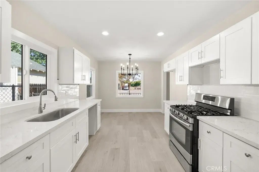 Renovated Spanish-Style Charmer in the Heart of Pomona! This beautifully updated 3-bedroom, 2-bathroom home blends timeless architecture with modern finishes. Situated on a spacious corner lot, this Spanish-style stunner features a classic red clay tile roof, a fresh monochromatic exterior paint scheme, and a welcoming front porch perfect for relaxing outdoors. A large bay window fills the living space with natural light, creating a warm and inviting atmosphere. Step inside to discover a tastefully renovated interior boasting a soothing greige color palette, arched doorways, and a statement fireplace with an elegant mantle. Enjoy all-new flooring, baseboards, recessed lighting, and interior doors throughout -- providing a truly move-in-ready experience. The remodeled kitchen offers new cabinetry, sleek countertops, and a stylish subway tile backsplash. The attached dining area is enhanced by a gorgeous chandelier, perfect for entertaining or enjoying every day family dinners. Just off the kitchen is a convenient laundry room that leads to a spacious, covered patio that extends to the detached garageideal for gatherings or peaceful outdoor living. Fully fenced for added privacy and peace of mind, the generous front yard offers a secure space for families to play and relax. Centrally located to the 10, 60, and 71 FWYs, dont miss the chance to own this unique blend of classic charm and modern comfort in one of Pomonas most desirable neighborhoods!
