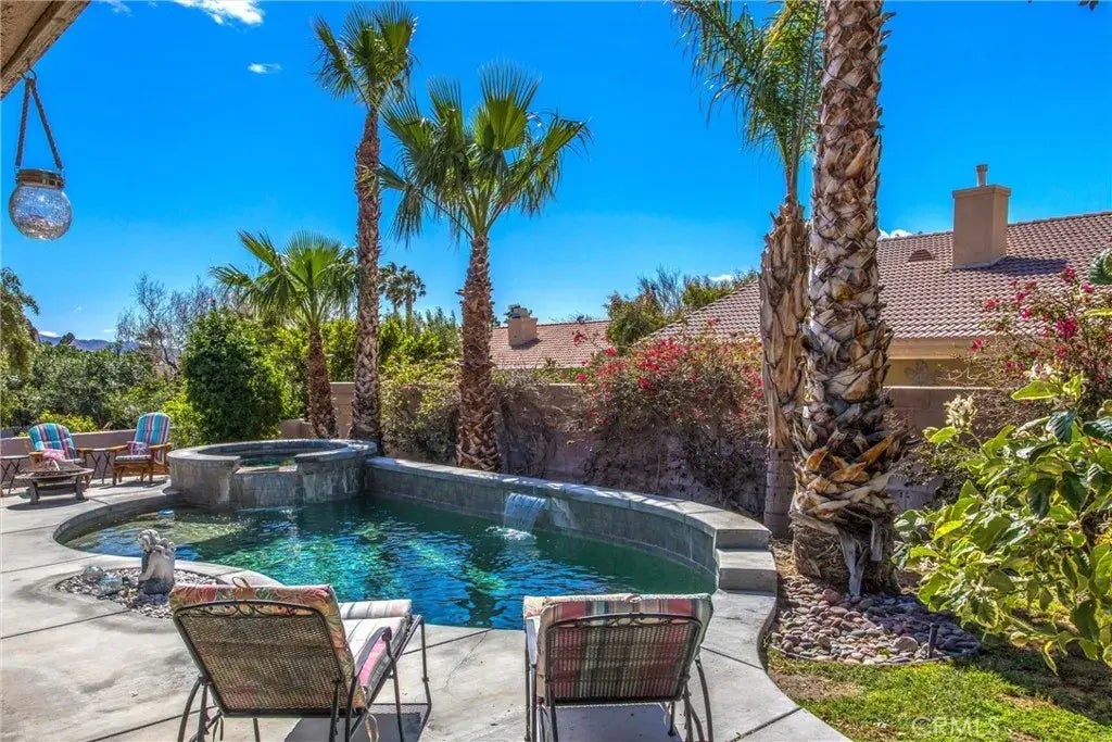 Custom-built, turnkey entertainers POOL home in the coveted Mission Lakes Country Club; enjoy modern upscale community comforts in your private oasis amongst the tranquility of the desert! Relish in the curb appeal of a gorgeous, low-maintenance desert dryscape front yard while beholding panoramic views of hills, city, and snow-capped mountains. Enclosed porch offers privacy and respite from the desert sun. Upon entry, take in an expansive living room with stylish tile flooring, vaulted ceilings, voluminous natural light, and mediterranean arches heralding entry to other living spaces. An open kitchen features numerous upgrades, including contemporary stainless steel appliances, abundant counter space, and vast amounts of storage via upgraded cabinets including a wine rack and fridge. Exit through the French doors into the heart of the experiencethe entertainers backyard, featuring home-length patio cover with fans and lighting; elegant stone pool with baja step, serene waterfalls, and elevated jacuzzi; and block walls and landscaping for complete privacy. On its on private wing, the master suite is a luxurious retreat, with an immense walk-in Closet, his-and-her sinks, a relaxing tub, a separate shower enclosure, and its own French Door exit to the backyard. Bedrooms 2 and 3 share their own private wing with upgraded full bath, and both feature oversized closets; one bedroom features sweeping mountain views north, while the other overlooks the backyard south and also has a 220V outlet. Indoor laundry room adjacent to garage. Dual pane windows as well as ceiling fans and fi