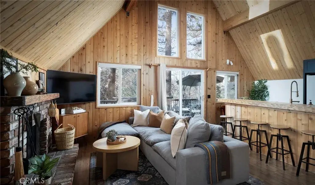 Welcome to The Goose & Bear Cabin, a classic and cozy A-frame nestled in the prestigious North Shore near Tavern Bay. Yes this home has lake rights to Lake Arrowhead! This charming cabin offers a serene retreat surrounded by towering pines, featuring a large wrap-around deck perfect for outdoor lounging, grilling, and relaxation around the fire pit. The expansive backyard is ideal for winter sledding, making it a year-round haven for families and friends. Inside, the tri-level design boasts 20-foot pine ceilings in the great room, creating an open and inviting atmosphere with a gas-assist wood-burning fireplace as the focal point. The main floor includes a welcoming living room, two bedrooms each with a queen-size bed, and one full bathroom. The remodeled kitchen features stylish charcoal cabinets and newer appliances, complemented by wood floors, walls, and ceilings throughout the home. The master suite, located at the top of the A-frame, offers beautiful tree views and a private half bath. The moody and cozy game room on the bottom level is perfect for fun and relaxation, with dark walls, a large sectional, a 70-inch 4K SmartTV, and new shuffleboard and foosball tables. The wrap-around deck includes a natural gas Weber BBQ, a large dining table with an umbrella, and a comfy patio sectional surrounding a gas fire pit, ideal for entertaining and enjoying the serene surroundings. Modern amenities include new 4K Smart TVs in all living rooms and bedrooms and a generator for added convenience and peace of mind. Situated in the sought-after North Shore area, The Goose & Bear Ca