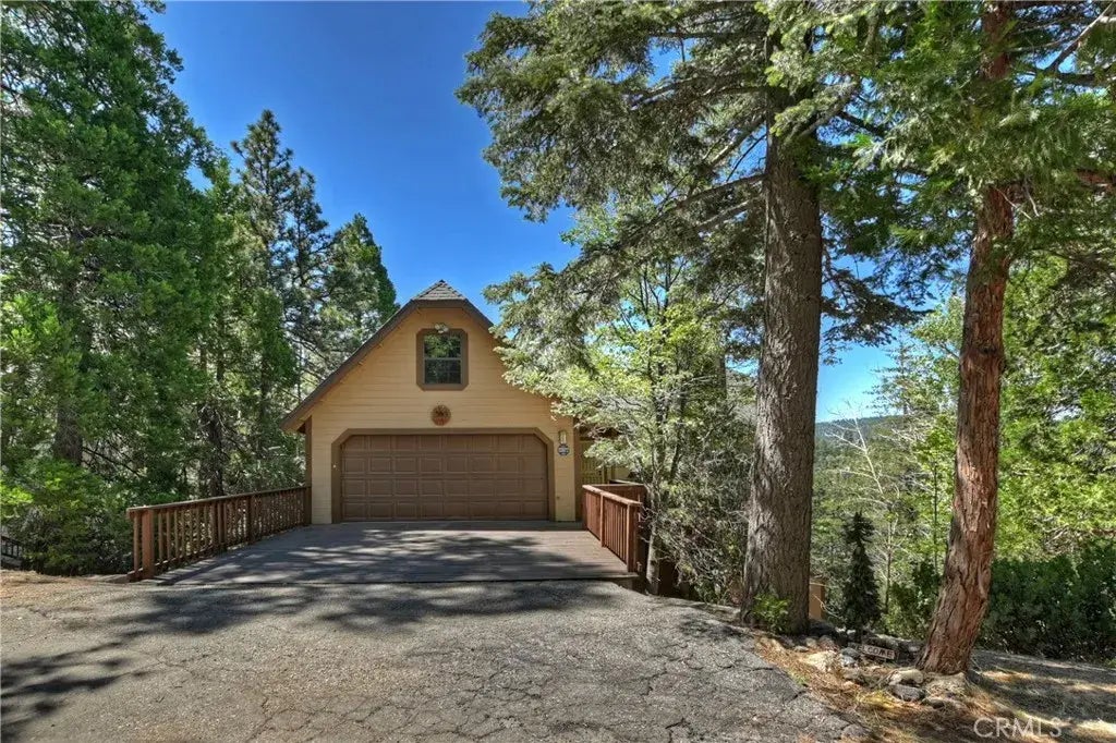 Available for backup offers! The coziest mountain getaway with all the modern amenities! Located on a private drive in a beautiful neighborhood, with serene & peaceful views. Easy year round living, just off the main road with level entry into your 2 car garage & straight into the house! The main level has an open and airy feel with vaulted ceilings & functional flow. Nice size living area with a charming rock fireplace, just adjacent is the kitchen with newer stainless appliances and then a good size dining area. There is also a half bath on the main level! Spacious rear deck to enjoy the gorgeous tree & far views! Downstairs are 3 bedrooms & a full bathroom. The primary has it's own bath & deck! Inside the garage you will find the laundry area and also a pull down stairway up to a nicely finished bonus area! Great space for an office or hobby room! Outside there is even a large shed for all of your extra gear! This house has been meticulously maintained & is ready to enjoy! A great little package in a very convenient location, just a few minutes to Blue Jay & Lake Arrowhead. House will be sold furnished & has AC too. A must see for the ultimate getaway!