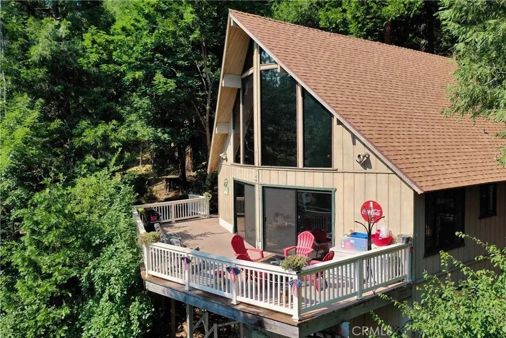 * * * * * * * * * * * * * * * * * Reach new heights with this Classic Prow architecture A-Frame. On the main level, a large living room with lava rock fireplace, knotted pine walls (this dcor is on two other levels as well), and slate tile floor is adjacent to a large dining room and gourmet kitchen (black granite countertops, stainless steel appliances, new double-door oven w/5-burner range) in an open floor plan with soaring beamed ceilings and oversize double sliders. Huge, tinted Cathedral windows hug the living area that dapple the main level with light as the home opens out to an unobstructed forest view on a wrap-around Trex deck. Two bedrooms and a full updated bath comprise the main level. Upstairs a Primary suite (& large walk-in closet) with 3/4 bath, also with vaulted ceiling, enjoys the view from its perched position over the living area and into a 1/3-acre shady forest enclave (w/2 apple trees, maple and oak) beyond. * * * * * * * * * * * * * * * A separate entrance and dedicated driveway (off Shenandoah) on lower level includes a living room with brick FP. Separated by double French doors; step into a second Primary Suite bedroom and full bath under a canopy of richly stained wood beamed ceiling and plentiful windows with natural light. * * * * * * * * * * * * *. * *Upgrades and amenities include Lake Rights, central air, 4 large screen mounted TVs (86, 70 and two 50), custom screen doors, a new exterior staircase leading up from the double wide concrete driveway (County maintained paved road; there is another entrance from a flat, asphalt access road), tankl