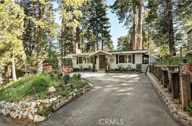 BACK ON THE MARKET AT NO FAULT TO SELLER! Welcome to Frontier Dr in Running Springs! An exquisite piece of real estate in the mountains, short drive to the city and SINGLE STORY, EXTREMELY RARE FIND IN THIS AREA! Boasting recent renovations, . Upon entry, you will discover a spacious living room with a fireplace, perfect for enjoying the view of the trees through the large picture window. Next to the living room is a sizable formal dining room with a vaulted & exposed wood beam ceilings with extra space to entertain guests! The kitchen is equipped with oak cabinets, new quartz countertops, ceramic backsplash, stainless and gorgeous (7k) 5-burner stove and refrigerator, pantry, kitchen island, breakfast nook, and enclosed laundry. The home features two good-sized bedrooms and 1 and 3/4 baths, as well as wood flooring throughout, a newer roof, and a tankless hot water heater. And new gutters. Lovely and great size side yard, There are two decks for outdoor entertaining, a large storage shed/workshop, covered storage, and a breezeway for easy access to the backyard. The property is located on a flat lot with ample parking and is conveniently situated near Hwy 330 for easy commuting and access to the mountains.