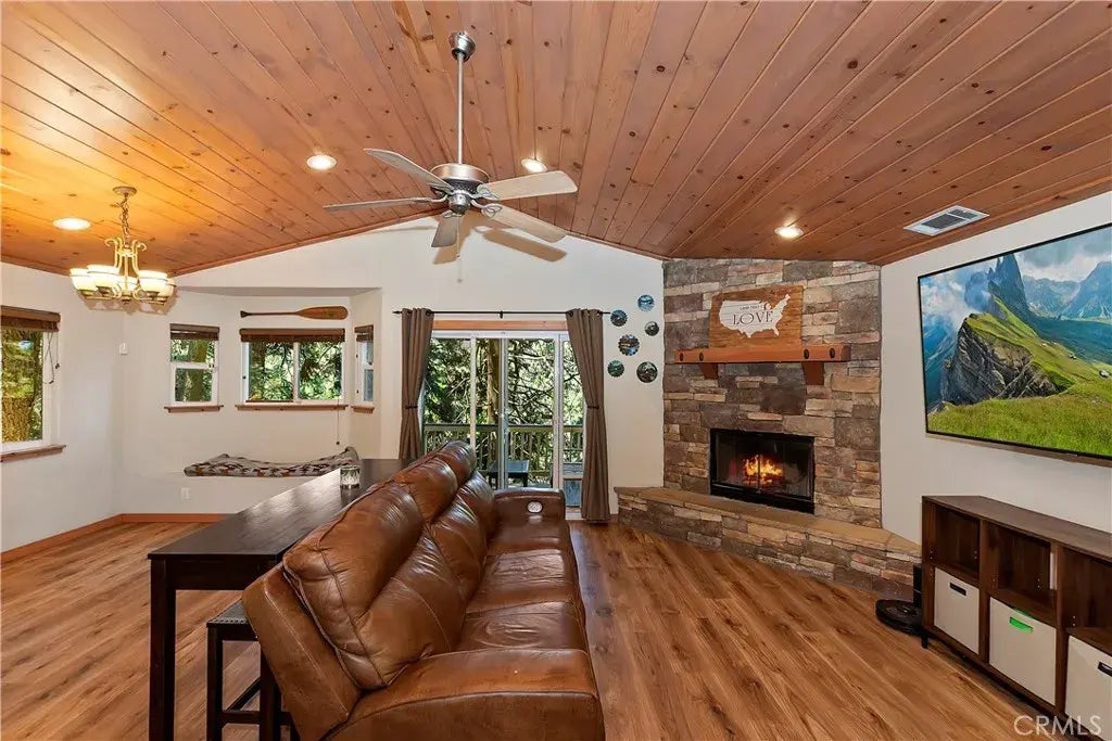 Welcome to this cozy, newer construction home! Perfectly nestled among tall trees, creating a serene and private setting. The house is a single-level entry with a warm and inviting exterior. Upon entering, you will land on a small platform with a coat closet and place for your shoes (perfect for winter months) overlooking the open floor plan that seamlessly connects the living, dining, and kitchen areas, and 1/2 bathroom making it perfect for both relaxing and entertaining. A large sliding glass door (opens up to the deck for a perfect extension of living space) and windows allow natural light to flood the space, offering views of the surrounding greenery and a beautiful fireplace adds a wonderful cozy feeling. The home features two bedrooms, each with its own en-suite bathroom, providing a private retreat for both occupants. The house also includes a dedicated office space, ideal for working from home. Overall, this home is a perfect blend of comfort, modern amenities, and a cozy atmosphere, making it an ideal retreat for those who appreciate the beauty of nature and the convenience of modern living.