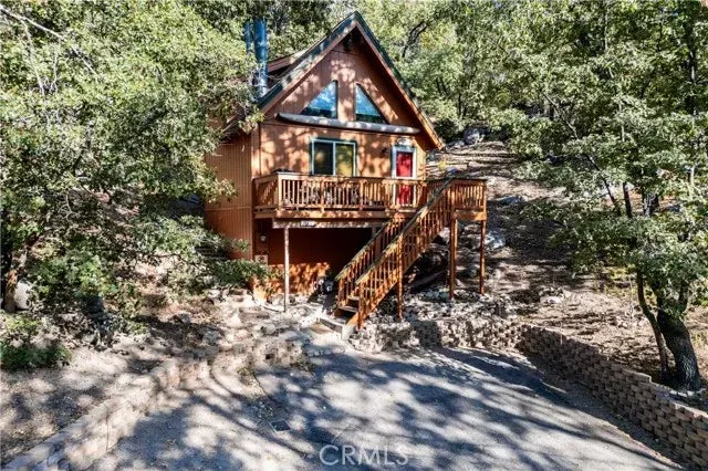 Welcome to this delightful 2-story home, nestled in the trees in Arrowbear Lake. This home is perfect for those seeking a quiet and peaceful place to relax and unwind, especially with the lake a short drive or enjoyable walk down the street! The property features a flat driveway that can accommodate three cars side by side, ensuring ample parking for family and guests. Walk up the stairs from the driveway onto the front deck which includes a BBQ and patio furniture, perfect for entertaining. The patio also features an electric awning so you can enjoy the space while staying comfortable.There is a wind sensor for the awning as well so it will retract on it's own if forgotten about. Step inside this newly painted home to discover an inviting interior, fully furnished (with some exclusions) inventory list to be provided, with high 2-story A-frame ceilings. The wooden paneling and cozy decor create a warm and welcoming atmosphere. The living area also features a fire place, wall heater, and tall windows for more natural light. Newer windows have also been installed, with one exception. The kitchen boasts beautiful wooden cabinets and is adjacent to the dining area. Off the side of the kitchen is the 3/4 bathroom, which is where the washer/dryer hook-ups are. Upstairs, you'll find a charming loft area with sloped ceilings and exposed wooden beams. There is a build-up under the front stairs as well for storage or a workshop. The big unfenced backyard provides endless outdoor opportunities. The lots on either side of the home are also included in the sale of the home. Don't miss t