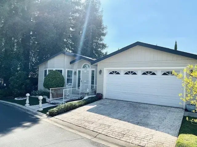 Forest like setting!!! In Highland's premier 55+ senior community. This 2000 Hallmark Winchester IV home, with approx. 1400 SF, features 2 bedrooms plus bonus, 2 bath, with attached 2 car garage and shed. This home is tucked away next to mature Costal Redwoods and is across from a fully paved walking trail with stream, offering a bit of nature with the convenience of all the parks amenities. This home features stamped concrete and brick steps up to the porch. Features include newer flooring, dual pane windows, ceiling fans and vaulted ceilings throughout. The kitchen has durable granite tile counters, solid wood cabinets, ample storage and an eat-in breakfast nook with plenty of light. Living and dining rooms open to each other in an open floor plan perfect for entertaining. The bonus room/office features French double doors with a slider leading to the patio and private back yard with lush landscaping and an extra-large shed. The spacious primary bedroom has a walk-in closet and a generously sized ensuite bath with a separate garden tub and shower. The guest room, bath and dedicated laundry room complete this home. Call or come in to schedule a showing!