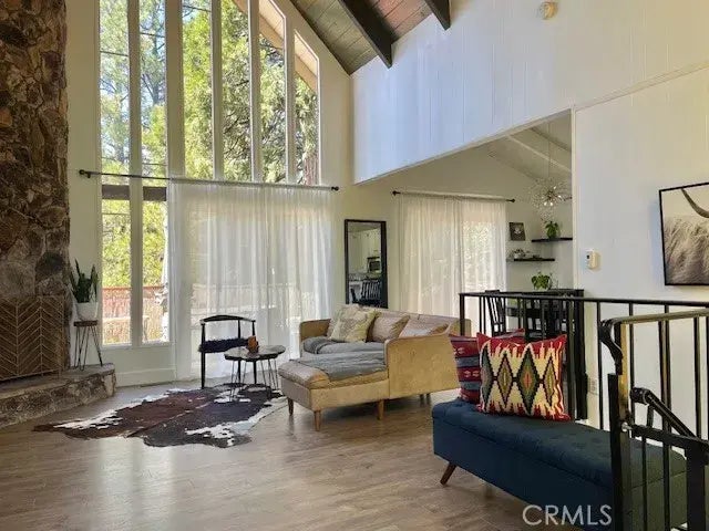 LAKE RIGHTS!! We are back on the market and Seller's are willing to give buyer a closing cost credit. This mid-century modern Lake Arrowhead home has a living space that features floor to ceiling windows, cathedral ceilings, a cozy gas and wood burning fireplace, and beautiful wood laminate flooring throughout. The sunny kitchen has a full suite of stainless appliances and plenty of cabinet space. The primary bedroom with full bath is located upstairs with two large bedrooms and full bath downstairs along with laundry room and large rumpus room. This dreamy home offers the perfect blend of privacy and charm, it's situated on a corner lot with U-Shape driveway with enough parking for three cars or more. This enchanted home feels like a secret hideaway ideal for mountain living yet only moments away from local restaurants, shopping, cafe's, and hiking and Lake Arrowhead Country Club.