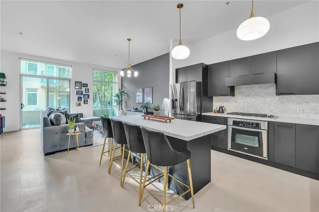 Indulge in the epitome of luxury living at the prestigious "Burbank Collection," where contemporary elegance meets the vibrant LA lifestyle. This exquisite studio residence offers a sophisticated urban retreat, perfectly situated adjacent to The Entertainment Village, home to premium venues such as AMC Theater, Starbucks, Noahs, Tender Greens, Barneys Beanery, and The Yard House, among others. Elevated with impeccable design, this highly upgraded corner unit features a bright, open floor plan with polished concrete floors, soaring ceilings, and striking floor-to-ceiling windows adorned with sleek automatic roll-up privacy shades. Step out onto a spacious private patio, perfect for enjoying serene outdoor moments. At the heart of the home, the beautifully reimagined kitchen stands out with quartz stone countertops, a marble tile backsplash, custom matte black wood cabinetry accented with matte black hardware, and high-end stainless steel and gunmetal black appliances. Designer lighting throughout enhances the expansive living space, making it ideal for entertaining, unwinding, or creating a home workout oasis. The luxurious bathroom offers dual vanities with stone countertops, a separate walk-in shower, and a deep soaking tub, providing a spa-like escape. Additional features include an in-unit stackable washer/dryer, two secure side-by-side garage parking spaces, and a private lockable storage unit. As a resident, you'll enjoy exclusive access to premier HOA amenities, including a sparkling outdoor pool, chic clubhouse with a billiard table, bocce ball court, putting green,