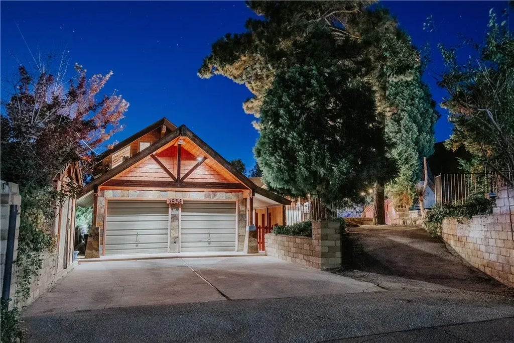 Welcome to the Sunset Lodge! Discover an exceptional mountain home in the highly sought-after Nob Hill neighborhood of Running Springs the Sunset Lodge has 2,692 square feet of authentic mountain living with features that truly set it apart. Inside, a four-sided fireplace is the artistic centerpiece beneath 20-foot vaulted ceilings, framed by soaring A-Frame windows that showcase 180-degree panoramic views. The open floor plan features distinct entertainment spaces including a TV area, dining area, and custom craftsman wet bar. The exceptional outdoor living spaces have received recent thoughtful improvements, including the 500-square-foot view deck (renovated in 2023 with glass rails), completely rebuilt side deck and front courtyard (2024), creating a private mountain spa retreat featuring a hot tub, tranquil waterfall, and ambient lighting. The property's ideal location on a generous 0.41-acre lot presents one-of-a-kind views, capturing a beautiful valley landscape during the day, breathtaking sunsets, and twinkling city lights at night. With 4 bedrooms, a bonus room, and 3.5 bathrooms thoughtfully distributed throughout, plus an unfinished basement for future expansion (potential bedroom plus game room), this home accommodates families and guests with ease. Amenities include central heating/AC, washer/dryer, generator, newly upgraded smart home features, tool shed, and EV charging. The property is minutes from Lake Arrowhead Village, Snow Valley Ski Resort, and numerous outdoor recreation areas. The property also features a two-car garage with a FLAT driveway (importan