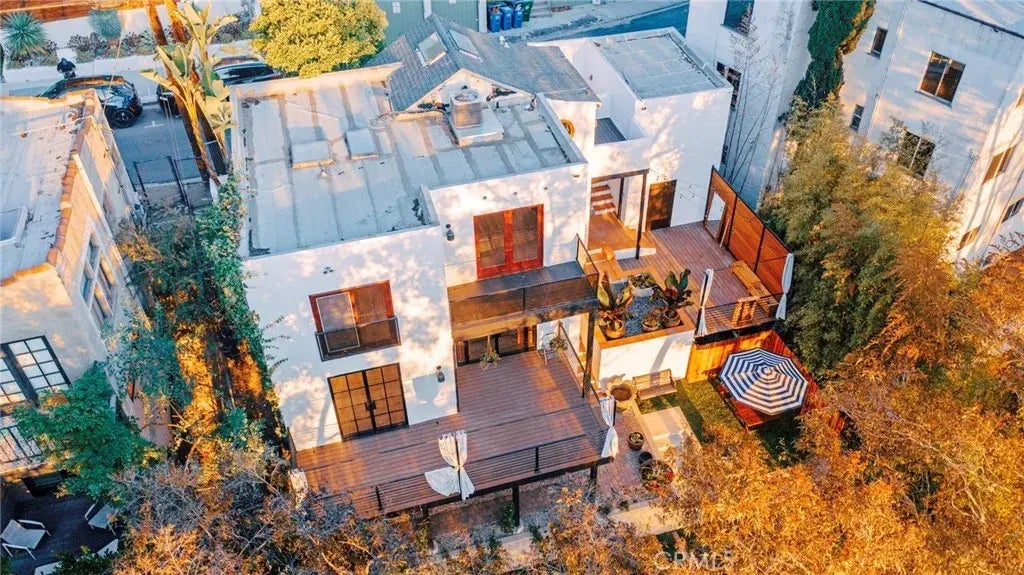 A beautifully remodeled 3-bedroom, 3-bathroom Moroccan inspired designer home in one of Silver Lakes most desirable locations across Bellevue Park. This thoughtfully designed residence blends modern Moroccan comfort with warm architectural character, offering a turnkey living experience with designer details throughout. Upstairs, you'll find a bright, open-concept living space anchored by a custom kitchen featuring pistachio green custom cabinetry, a farmhouse apron sink, and luxe paneled appliances. A round porthole window off the kitchen adds a charming architectural accent, while another larger porthole window in the dining room creates a stunning focal point and fills the space with natural light. Expansive tri-folding sliding doors open from the kitchen to another patio allowing you and your guests to approach the terrace backyard. A spiral staircase leads you to two spacious large primary suites with each featuring their own en-suite luxe bathrooms with gorgeous walk-in showers and even a soaking tubperfect for privacy and spa-like living. The upstairs bedroom is adjacent to a full hall bathroom with desert rose colored tiles, adding a touch of retro LA flair. Additional highlights include: a private 1-car garage, separate laundry room with washer & dryer included, an awesome dog-run in the back yard, three citrus trees: Meyer lemon, grapefruit, and mandarin trees, along prime Silver Lake location just minutes from Sunset Junction, cafs, shops, and parks. This home effortlessly combines style, function, and locationperfect for those seeking modern living in one of LAs