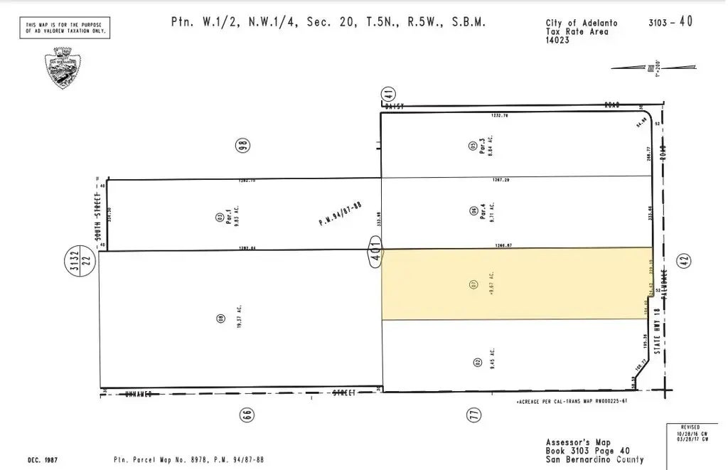 9.6 acres of land on Palmdale Rd in Adelanto; APN: 3103-401-07. Dual zoning creates an approximate estimate of 4.6 acres of Commercial ( C ) land with 334 ft of frontage on Palmdale Rd and 5 acres of Singe Family Residential (R-S5) allowing for up to 5 dwelling units per acre. Water at site with sewer nearby. More than 5,000 developed rooftops in the immediate area, with many more under construction. This property is also located within Adelantos Opportunity Zone, for potential tax deferment. Local amenities include Stater Bros Market, Starbucks, Walmart Supercenter, AutoZone, CVS Drug Store, El Pollo Loco, Panda Express, and more.