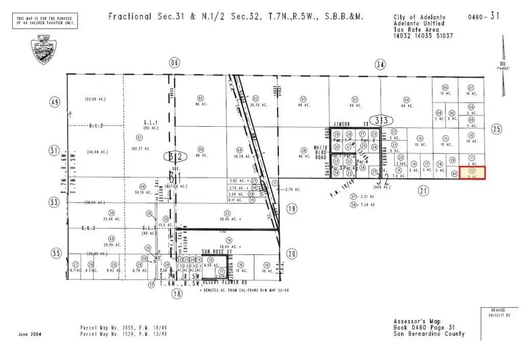 5 acres of unimproved residential land on Purple Sage St. in Adelanto; APN: 0460-313-12. Zoned Rural Living (RL-5) this lot resides under San Bernardino Countys jurisdiction and permits for the development of 1 dwelling unit per 5 acres. This location is also within a Qualified Opportunity Zone and eligible for potential tax benefits. This site is in proximity of the Southern California Logistics Airport. The Airport recently completed approximately 4MM square ft of expansion and is now home to major global leaders of industry such as Amazon, Boeing, GE Aviation, Kuerig Dr. Pepper, M&M/Mars, Newell Rubbermaid, and more. As an extension of the Inland Empire, the High Desert continues to grow with millions of square feet of planned industrial and tens of thousands of housing units under construction. Buyer to verify all information contained herein. Agent and their representatives are not responsible for the accuracy of these claims.