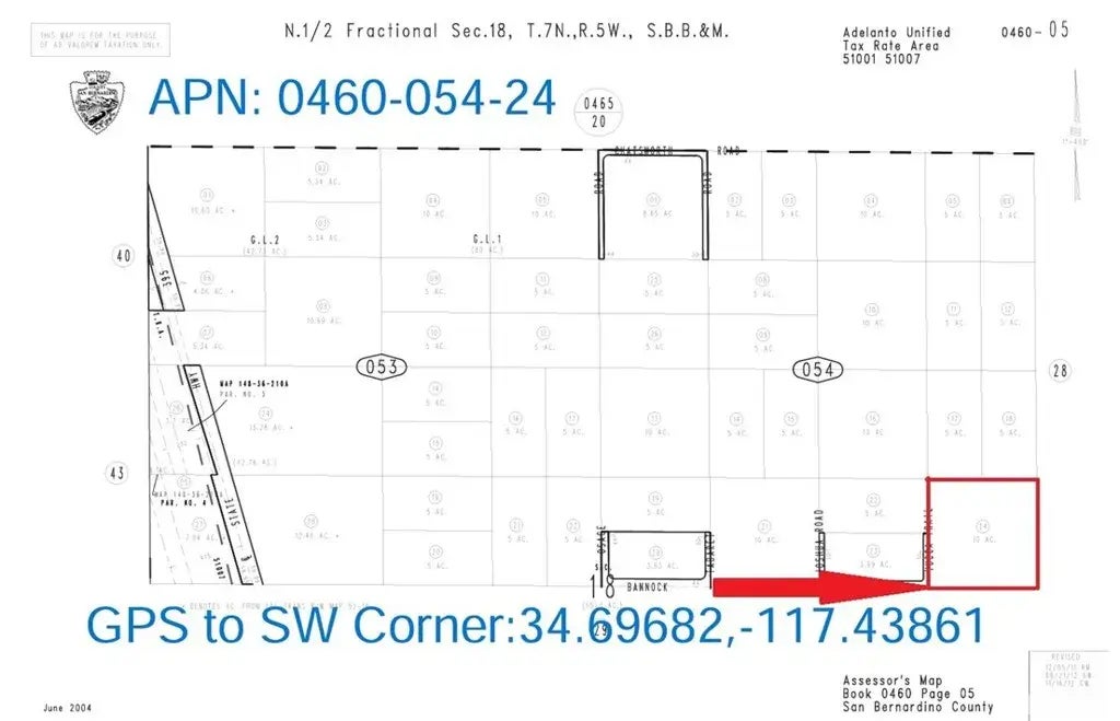 10 Acres (APN: 0460-054-24-0000) GPS: 34.696910, -117.438550 This 10 acre property is located north of Adelanto CA. Adelanto, California, is situated in San Bernardino County within the High Desert region of Southern California. This property lies within the unincorporated area of the San Bernardino County within the 'Rural Living' zoning with a 5 acres minimum. According to the County this land use designation zoning district provides for rural residential uses, incidental agricultural uses and similar and compatible uses. Properties with this designation can be subdivided into 5 acre parcels. Electricity is approx. 0.8 miles west, this is a septic and propane area. Residents in the area have private water wells, as no public water companies service the area. Adelanto is a city located in San Bernardino County, California, United States. The city is situated in the Mojave Desert, and its name means 'progress' or 'advance' in Spanish. Adelanto has a diverse population, with a mix of different ethnicities and cultures. Additionally, Adelanto has a number of parks and recreational facilities, making it a great place for outdoor activities. Overall, Adelanto is a unique city with a rich history and a variety of offerings for residents and visitors alike.