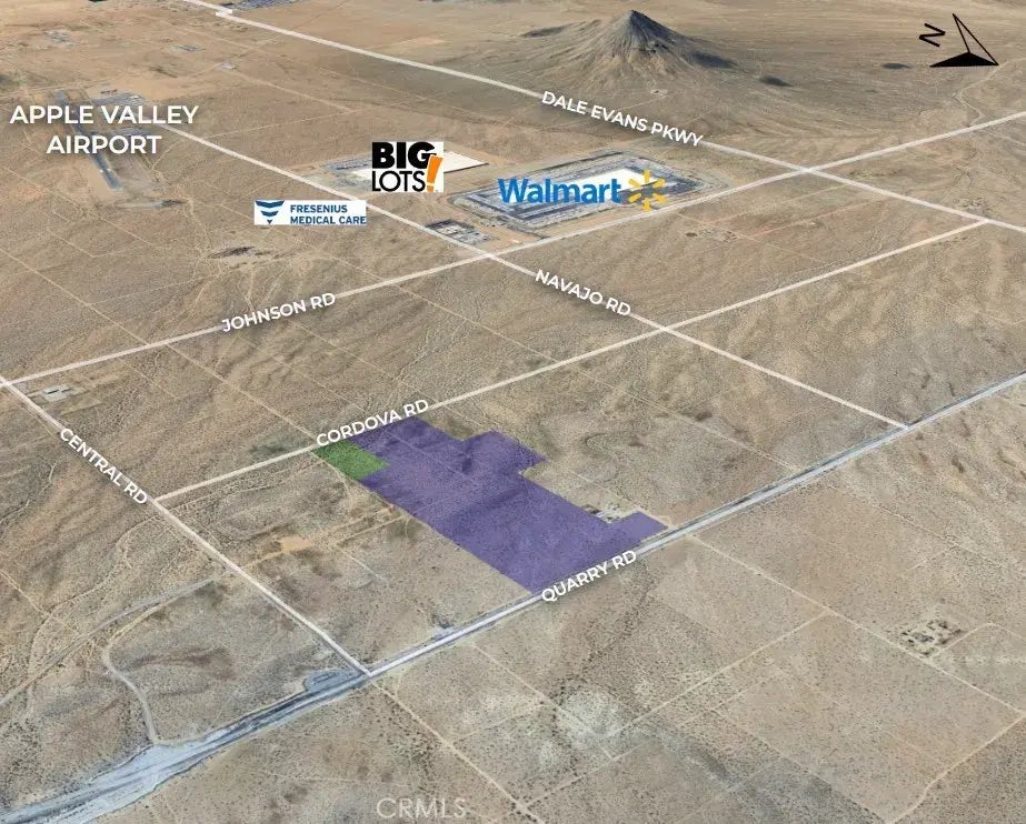 Offering 61.96 of vacant industrial land with approximately 570 feet of frontage on Cordova Road in Apple Valley. The site, zoned I-G General Industrial, is one of the last remaining large offerings within the North Apple Valley Industrial Specific Plan, a roughly 6,200-acre plan designating land for various industrial and commercial applications. Utilities are at the site with power lines along the north boundary and 12 water lines present in various locations surrounding the property. The North Apple Valley area is experiencing rapid growth with approximately 16M sf of industrial warehouse space currently in various stages of the entitlement process. Located just one mile northeast of the Walmart, Big Lots, and Fresenius Medical Care distribution centers and three miles southeast of the planned Brightline West passenger station and maintenance of way facility, this site is situated among well established as well as highly anticipated development. Buyer is encouraged to complete their own due diligence and verify all information contained herein.