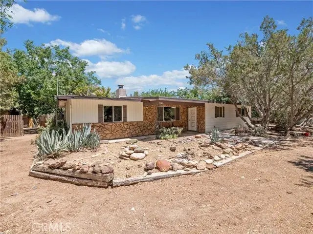 Discover this spacious 2,286 +/- square foot home nestled on over one acre of land, offering an idyllic and private park-like setting. Recently updated, this 4-bedroom, 2-bathroom residence boasts new interior paint and carpet throughout, with a refreshed kitchen featuring new formica counters, painted cabinetry, and stainless steel appliances. Upon entry, a generous open living room with a charming brick fireplace welcomes you, seamlessly connecting to the kitchen and an expansive enclosed patio. This versatile great room is perfect for family gatherings or entertaining guests. The home's split floor plan places one bedroom opposite the living area, with the remaining three bedrooms on the opposite side. Outside, an oversized enclosed patio leads to a large back patio enveloped by mature trees, ensuring unparalleled privacy. Along one fence line, a series of storage sheds offer ample space for storage needs. The shaded area off the back patio is ideal for a gazebo or outdoor kitchen, complemented by the natural cover provided by the large trees. The property extends to the rear, providing plenty of room to potentially add a detached garage, barn, or additional dwelling (subject to necessary permits). Centrally located in Hesperia with convenient commuting access, this property offers a wonderful opportunity to establish your ideal home. This listing captures the essence of spacious living in a serene, private setting, perfect for both relaxation and entertaining.