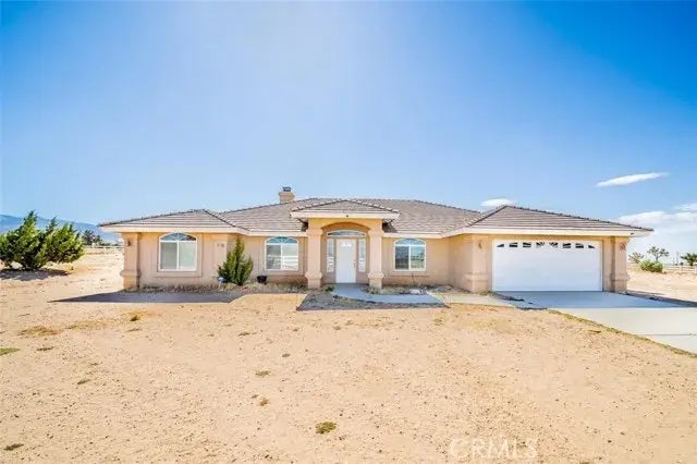 Price just reduced!!! Stunning home with Mountain and Desert views. Split floor plan Formal entry, livingroom with fireplace opens to hugh kitchen featuring walk-in pantry and breakfast nook. Master suite features walk-in closet and bath with jetted tub and separate shower. Ceiling fans thru-out. Separate laundry room offers lots of storage. 2 plus acres completely fenced with vinyl 3 rail and wire fencing Ready for animals or toys with lots of room to ride. Just over half mile from paved road. Award winning Snowline School District. Covered patio to enjoy the High Desert climate. Solar information.....Mthly payment $169.00. Lease is assumable