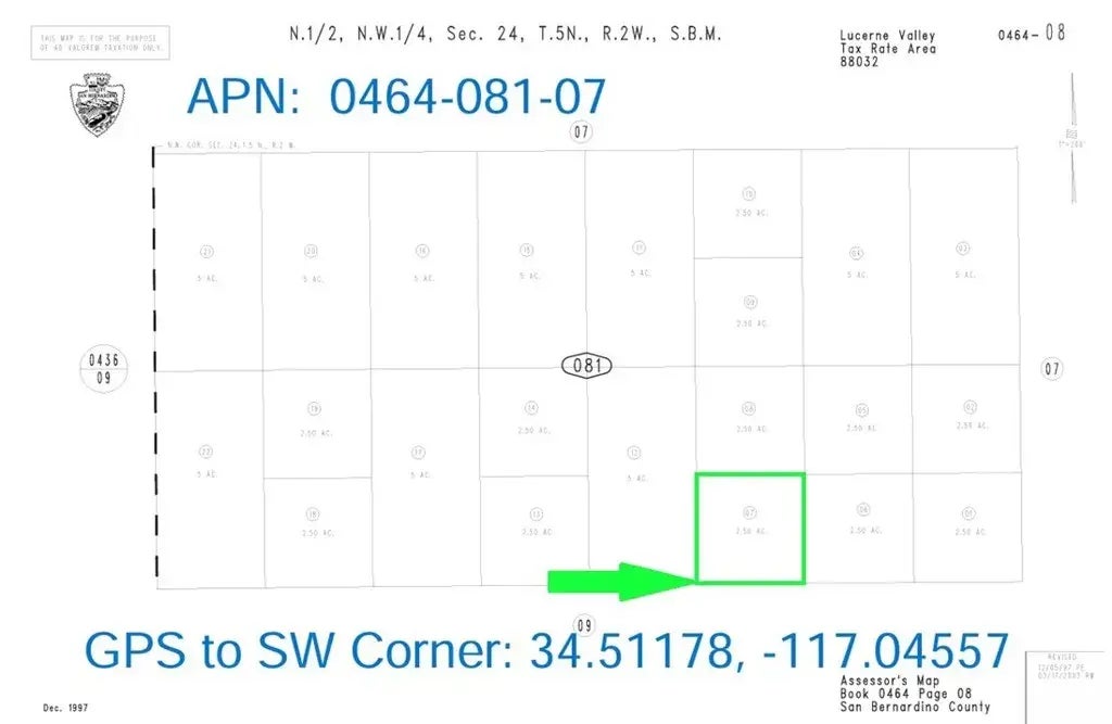 2.5 Acres (Apn: 0464-081-07) GPS: 34.51178, -117.04557 This property is located in eastern Apple Valley, CA. The town of Apple Valley is situated in the southern part of the state, within San Bernardino County. This property lies within the unincorporated area of the San Bernardino County within the Apple Valley 'Resource Conservation' (LV-RC) zoning. This zoning means it's all about protecting natural spaces while offering plenty of recreational fun. Single Family homes are permitted in this zoning. This area is northern Lucerne Valley with a mixture of private and government land. Overhead electricity is approximately 4.1 Mi SSE. Residents in the area have private water wells, septic tanks and propane tanks for their utility needs. Overhead electricity is approx 2 miles NW. Residents in the area have private water wells, septic systems and propane tanks for their utility needs. Apple Valley is a charming town located in the high desert region of California. With its picturesque landscapes and clear blue skies, it offers a serene escape from the bustling city life. The town is known for its annual Apple Valley Airshow, showcasing impressive aerial displays and attracting aviation enthusiasts from far and wide. The majestic Mojave River flows through the area, providing opportunities for outdoor activities like fishing, hiking, and camping. Apple Valley's community spirit is evident in its local events, such as farmers' markets and cultural festivals, making it a welcoming and vibrant place to visit or call home. This property does not yet have an address. While the boundar