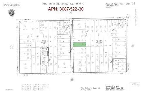 Lot 38, 0.7 Acres (Apn: 3087-522-30) GPS: 34.477125, -117.185604 This residential lot is located in Apple Valley, CA. The town of Apple Valley is situated in San Bernardino County. This lot is within the Town of Apple Valley and the Apple Valley Unified School District. The property is zoned Single Family Residential (R-SF). Overhead electricity is on site. Golden State Water Company - Apple Valley South System services the areas water needs. Apple Valley is a charming town located in the high desert region of California. With its picturesque landscapes and clear blue skies, it offers a serene escape from the bustling city life. The town is known for its annual Apple Valley Airshow, showcasing impressive aerial displays and attracting aviation enthusiasts from far and wide. The majestic Mojave River flows through the area, providing opportunities for outdoor activities like fishing, hiking, and camping. Apple Valley's community spirit is evident in its local events, such as farmers' markets and cultural festivals, making it a welcoming and vibrant place to visit or call home. This property does not yet have an address. While the boundary lines on the map offer a glimpse, they are only approximate. A Buyer should verify boundaries, zoning and utilities, ensuring every aspect aligns with their vision for the property.