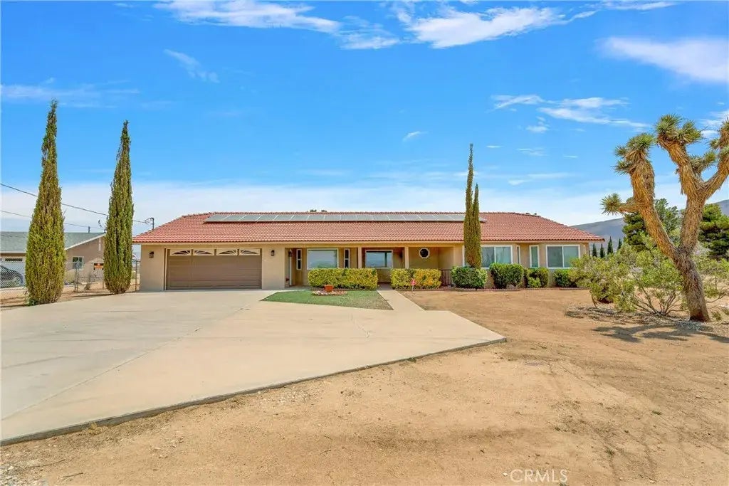 Enjoy breathtaking views from this beautifully situated home in Apple Valley nestled on 3/4 of an acre of horse property. Built with durable 2x6 construction, the home boasts large living areas, including a generous living room, dining room, and kitchen perfect for entertaining. Each bedroom is oversized and features charming bay windows, adding elegance and natural light. The entire home has been freshly painted inside and out. Enjoy new windows, flooring, upgraded stainless steel appliances, and lighting throughout. Indoor laundry with a washer and dryer! Paid Solar Panels: Benefit from significant savings on energy bills with the fully paid solar system, contributing to an eco-friendly lifestyle. Extra Large Garage with Workshop Area with Plenty of room for vehicles and hobbies, with a dedicated workshop space for projects. A large, detached 24'x32' workshop with 30amp Rv hook-ups and swamp cooler, which could potentially be converted into an ADU (Accessory Dwelling Unit). A Metal carport and 12x12 Shed are additional structures on the property to provide extra storage and functionality. The property is completely fenced with two gate openings, making it easy to move larger vehicles or trailers throughout the lot. Large, covered porch in the front and large covered patio in the backyard for your gatherings. This Apple Valley gem combines stunning views, some modern updates, tranquility, and functional spaces, making it an ideal choice for your next home.