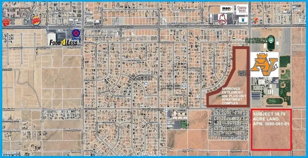 PRIME 38.79 ACRE OF CORNER LOT!! Only 1 block 1 block south of signalized intersection Bear Valley Rd and Navajo Rd where Stater Bros. Shopping center located along with Big Lots, Dutch Bros Coffee, Jack in The Box, Arbys, Subway, Nick's Pizza, 7/11 and many other businesses. FLEXIBLE ZONING (Please check with Town of Apple Valley). Town of Apple Valley just approved a 400 plus unit apartment complex right across the land for another developer. An excellent opportunity to develop this prime piece of property. MOTIVATED SELLER MIGHT BE OPEN TO SELLER FINANCING WITH 50% DOWN AT REASONABLE INTEREST RATE!! Submit your offer today!!