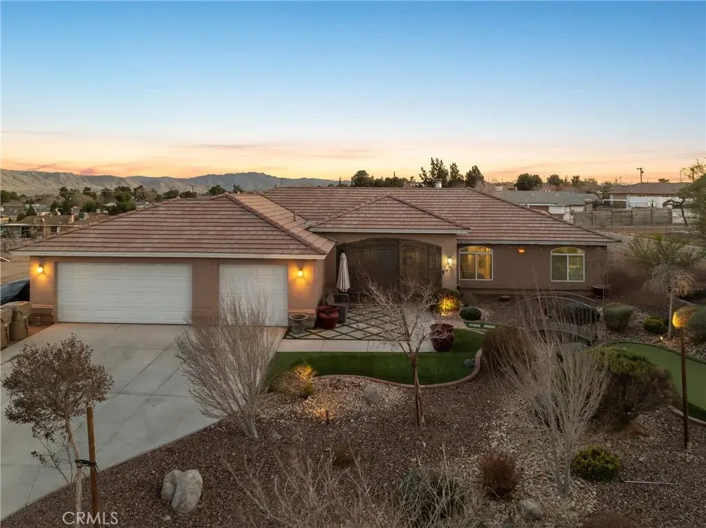 Spacious 4-bedroom, 2-bathroom home in Hesperia with a heated saltwater pool, spa, and RV parking! Built in 2016 on a 20,000 sq. ft. lot, this single-story, move-in ready home offers 2,100 sq. ft. of open-concept living. The kitchen is a showstopper with a large island, granite countertops, and a breakfast nook, perfect for gatherings. The primary suite is tucked away from the other bedrooms for added privacy, featuring a dual-sink bathroom with granite counters, a separate shower and tub, and plenty of space to unwind. High ceilings and a gas fireplace with artificial logs create a warm and inviting living space. A separate laundry room adds convenience. The front yard boasts desert landscaping with artificial grass, offering great curb appeal, along with an enclosed front patio for added privacy and outdoor enjoyment. The backyard is an entertainers dream, featuring a covered patio, a sparkling heated saltwater pool and spa with colored lighting, and stunning desert viewsperfect for relaxing or hosting guests. Additional features include RV parking with full hookups for electric, water, and sewer, a 3-car garage, a large driveway with extra parking space, and an already leased solar systemno need for additional batteries. Located near Victor Valley College, Jess Ranch shopping center, Mojave Narrows Park, Mojave Riverwalk, and Spring Valley Lake, this home offers convenience, outdoor recreation, and dining just minutes away. No HOA means more freedom to make this home truly your own. A must-see for those looking for space, comfort, and resort-style living!