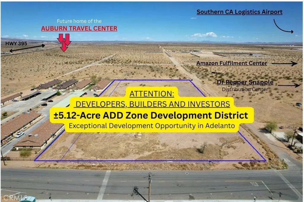 Exceptional 5.12-Acre Development Opportunity in Adelantos ADD Zone This 5.12-acre parcel, consisting of two parcels (APNs 0459-053-33 & 34), in the highly sought-after Airport Development District (ADD) of Adelanto offers an exceptional opportunity for Developers, Builders, and Investors. Located just two city blocks Southeast of the exciting Auburn Travel Center LLC development, this property is ideally positioned in one of Adelantos most prominent industrial zones, making it perfect for a wide range of Commercial, Industrial, and Logistical Projects. The site enjoys easy access to Highway 395, ensuring seamless connectivity to local and regional markets, which makes it an ideal location for distribution centers, warehouses, and other commercial uses. The surrounding area is experiencing a surge in investment, driven by ongoing industrial and residential growth. The ADD Zone is central to the citys long-term vision, with nearby developments such as the Adelanto Industrial Center and Ecosave Warehouse Facilities, further cementing this location as a growing hub for logistics and commercial activity. The Auburn Travel Center, set to break ground in June 2025, will include a 5,866 sq. ft. Convenience Store, a 945 sq. ft. Office, and a 20-Pump Fueling Station, along with a 3,400 sq. ft. Drive-Thru Restaurant, a 10,500 sq. ft.Mmulti-Tenant Retail Building, and a 16,702 sq. ft. Supermarket. The development will also feature a 9,620 sq. ft. Retail Building, a 5,577 sq. ft. Automated Carwash, and a 68,054 sq. ft. Hotel with 100 Suites, offering amenities like an Indoor Pool, Outd