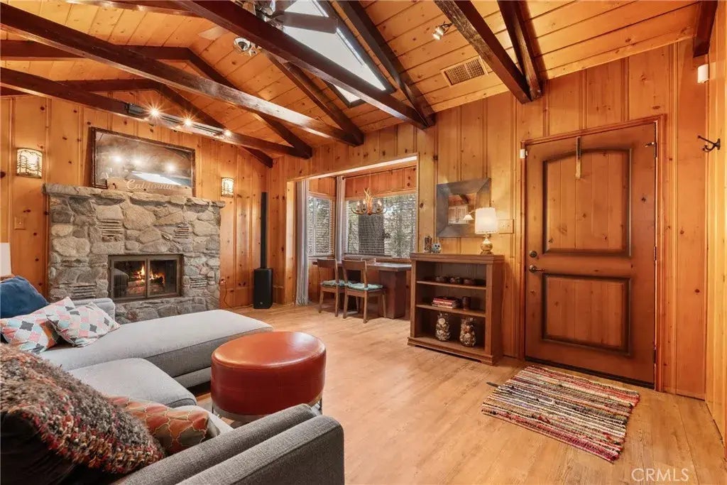 Luxurious and cozy, come fall in love with this turn key mid century cottage in one of the best locations in Wrightwood, across from the historic "Acorn Lodge", this West side bird street stunner has multiple outdoor entertaining and gardening spots, lending itself to both family gatherings and peace and quiet... Walking up, you're warmly greeted by the freshly painted front deck and impressive cottage like front door. Vaulted ceilings, open beams and knotty pine tongue and groove adorn the spacious living room with large picture window looking onto your front deck and lilac filled front yard, with charming wood burning fireplace that really sets the mood. Living room opens to your gorgeous kitchen with designer granite, maple cupboards (and plenty of em), stainless steel appliances, hammered copper farm house sink and eat in kitchen counter bar. Access to your bountiful side yard off of country kitchen dining area. This two bedroom home offers a large master suite as well, with more vaulted ceilings and open beam effects, coffee bar area, dual copper sink vanity, more luxury granite and maple, walk in shower with river rock floor, modest walk in closet and dual access to the park like yard as well. This versatile cottage has the ability to be split into two separate areas, with dedicated keyed entries, perfect for a bnb option while another unit is occupied full or part time!! Speaking of the yard, you may as well register this lot with the forest service and charge admission!! Its like a park, with drip system throughout, native lilacs and vinca, meticulous native stone w
