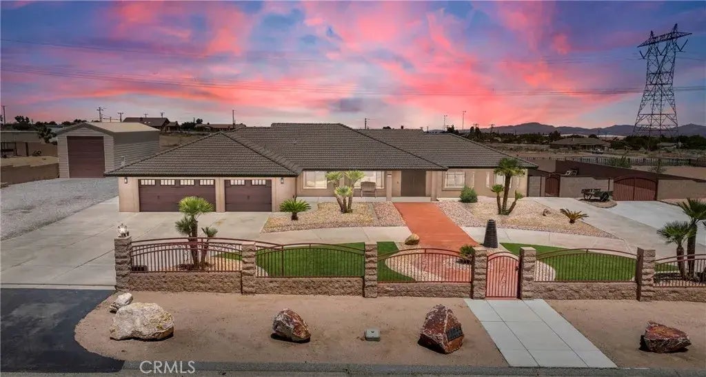 GORGEOUS OAK HILLS ESTATE POOL HOME with RV GARAGE and PAID FOR SOLAR! This Beautiful 4 Bedroom 2 1/2 Bath Turn Key Oak Hills home is located on 2 1/2 acres on a Paved road with great access to the I-15 and all amenities. Bonus features include Efficient Paid for Solar, Fencing, Block Walls, Rod Iron Gates, an automatic Gate Opener, Covered Patios, Landscaping , Pool, Spa, Custom Fire Pit with a table, built in Trampoline, Three Car Customized Garage, Gazebo and the RV Garage. This Estate is an Oasis in the desert. Room for all your toys. The RV Garage is 20 x 50 with a 14 roll up door. On this home you will find Freshly painted Eaves, Fascia and Freshly painted Exterior of the home. The Interior also has been freshly painted. Upon entering the front door you will notice the Customer Barn Doors that lead you into the spacious Living Room and Formal Dining Area. All wood look tile floors throughout this home and new carpet installed. The Great Room/Family room has a Wood Burning Stove that is the heart of the home. This is open to the Large Kitchen with Plenty of Cabinet and Countertop space for a chefs kitchen. There are Granite Countertops and all New Appliances. The Breakfast nook overlooks the Backyard Pool area. There is a large Butlers Pantry off the kitchen. The 2 and 1/2 Bathrooms and Mud Room/Laundry Room have been remodeled with new quartz countertops, new sinks, new toilets and new fixtures. The Main Bedroom Suite features a Spacious Closet Room and a Custom Barn door on the On Suite Bath with a fantastic Shower and the Soaker Tub of your Dreams. New sinks and toi