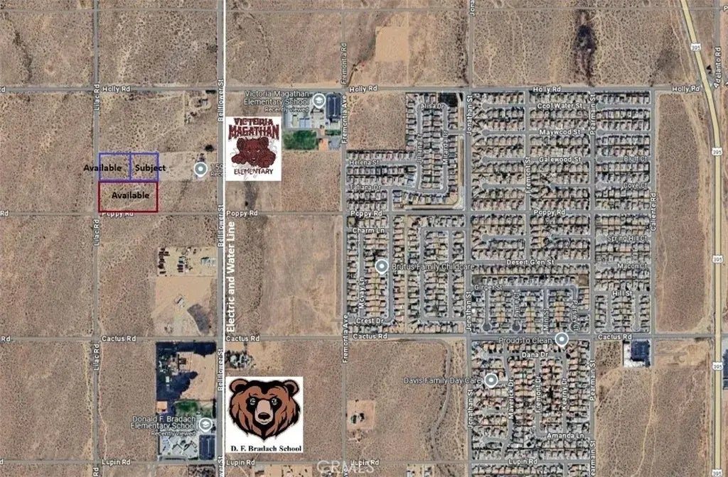 Possible 44 lot subdivision in the City of Adelanto. For sale is 2.09+- acres with up to 8.79+- being available of Single Family R-S5 zoning which allows 5 homes per gross acre with a minimum size of 5,000 sq feet per lot. Thus this lot can have up to 10 homes per the zoning and up to 44 lots with the other lots that are available adjacent to this lot. This lot has 317 feet of road frontage on Liliac Ct (a no-named court off Liliac Rd) and with all 3 lots, then 636 feet on Poppy Rd. This lot is in the path of development and walking distance to two elementary schools. Electricity and water is on Bellflower St and possibly sewer. Buyer to verify. The owner has a real estate brokers license. The GPS Coordinates to this lot are: NW: 34.541127, -117.420268 NE: 34.541131, -117.419227 SW: 34.540336, -117.420271 SE: 34.540340, -117.419222