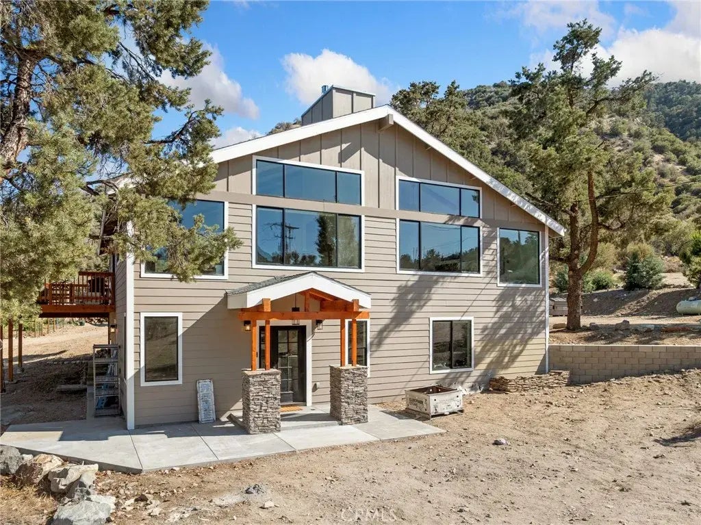 Situated on 3.1 acres in the scenic foothills at the base of Wrightwood and located in the community of Oak Springs Valley, 7549 Sand Canyon Rd was beautifully rebuilt in 2024 (keeping just one original interior wall) and offers 2,645 square feet of thoughtfully designed living space. With 3 bedrooms and 3 bathrooms, this residence combines a modern aesthetic with the natural beauty of its mountain surroundings. The interior features vaulted ceilings with exposed wood beams, wide-plank flooring, and expansive windows that flood the home with natural light. The main living area centers around a striking stone fireplace, creating a warm, inviting atmosphere. The open-concept kitchen is equipped with sleek stainless steel appliances, solid quartz countertop with beautiful backsplash, a spacious center island, and clean-lined cabinetry, making it both functional and stylish. This enormous great room seamlessly sets the kitchen, dining area, and living room all within an expansive space which will be the perfect place to live and entertain. Both upstairs and downstairs family rooms provide flexible space for gathering, working, or relaxing. The layout is airy and intuitive, offering comfortable flow throughout the home. The primary suite offers beautiful views of the valley and trees to the north and boasts a primary bath with dual vanities, a claw foot tub with its own picture window, a walk-in shower, and separate toilet. Outside, a relaxing patio offers a quiet place to unwind, surrounded by mature trees and mountain views. The property has a detached original 2 car garage, b
