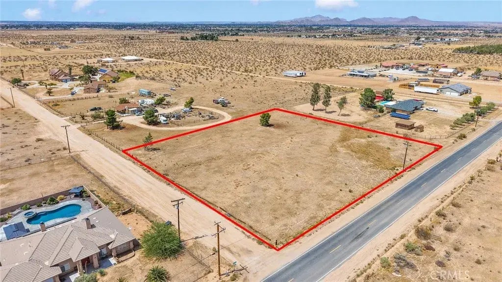 Corner lot on PAVED JOSHUA ROAD in the county area of APPLE VALLEY just off BEAR VALLEY ROAD. This unusual find is a water well area, but has natural gas at the street. Next door home is connected to the gas main. Electric also at the road. This property is listed alone, but the seller has also listed the neighboring house and two lots that sit at the West property line of this large 2.5 ACRE lot: lots 15, 16, 17 listed separately. This property is IDEAL in that it is unincumbered by terrain, vegitation, or access issues. It is FLAT, on a PAVED ROAD, utilities at the road; and once a well is installed, will enjoy free use of water. Imagine having an orchard, horses, livestock, etc. on your very own lot. Gorgeous mountain views. Stores and conveniences just MINUTES from this location. New big box retail is currently under construction just a few miles from this location so the convenience for grocery and retail are only getting better!