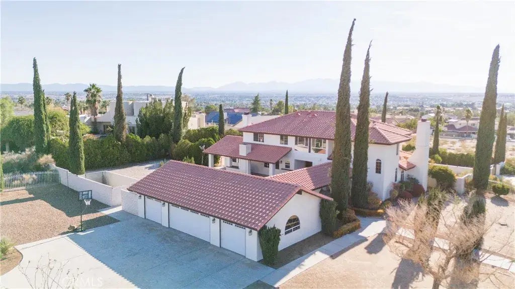 View! View! View! Spectacular Custom Home in Apple Valley Nestled at the end of a peaceful cul-de-sac, this stunning custom-built home sits on a generous 38,500 sq ft corner lot with sweeping valley views. Offering 3,674 sq ft of refined living space blends timeless Spanish-style architecture with modern comfort and luxury. The home features 3 bedrooms, 2.5 bathrooms, a formal dining room-perfect as a flex space, a private office-potential 4th bedroom, and an oversized 4-car garage. Enter through a charming arched walkway and double glass doors into a light-filled interior with elegant tile and hardwood floorings, soaring arched windows, warm tones, and a cozy fireplace that adds character and sophistication. The chefs kitchen is designed to impress-featuring Corian countertops, a farmhouse sink, prep sink on a large center island, Viking appliances, and a wet bar with wine cooler-flowing seamlessly into the family room and breakfast area. Upstairs, a custom wood spiral staircase adorned with Spanish-style tilework leads to the luxurious primary suite, where a private balcony reveals breathtaking valley views. The spa-inspired bathroom includes a large soaking tub, walk-in shower, dual vanities, and a walk-in closet. Two additional bedrooms provide abundant natural light and views, while the spacious laundry room and enclosed patio with a second wet bar enhance everyday comfort. At the end of the day, unwind in a serene courtyard framed by cypress trees, fruit trees, and lush, mature landscapingideal for entertaining or quiet evenings. Located in one of Apple Valleys most d